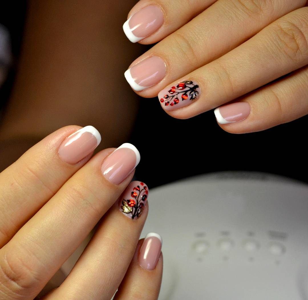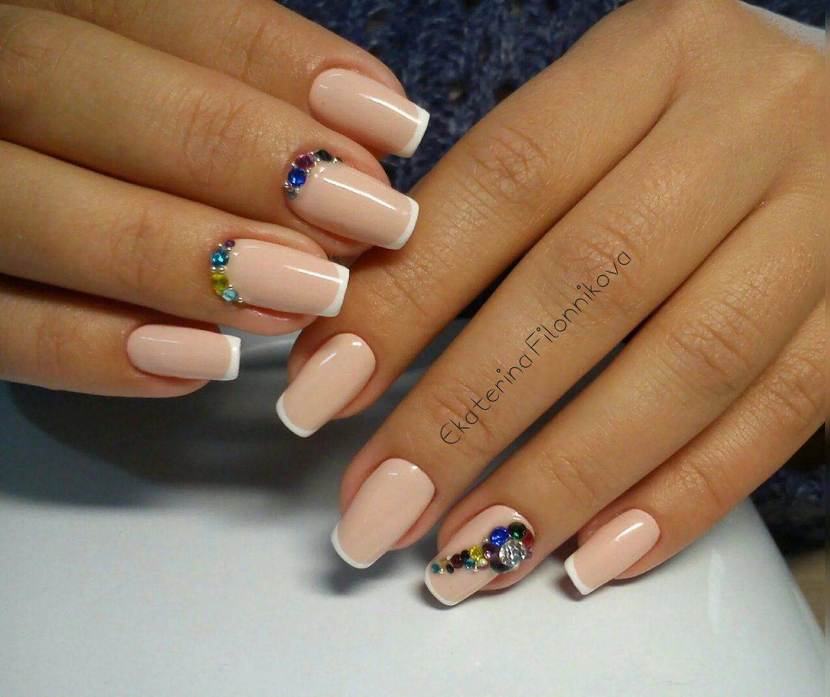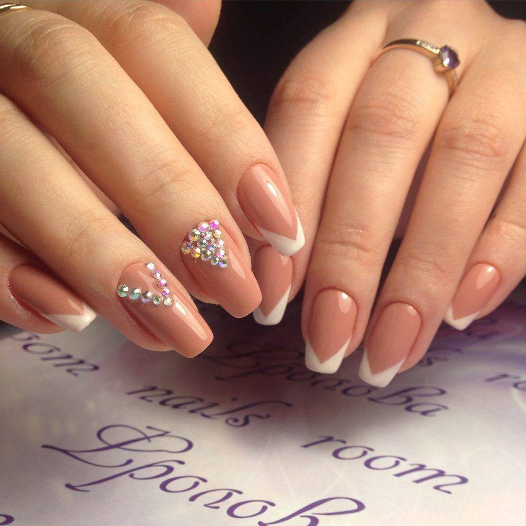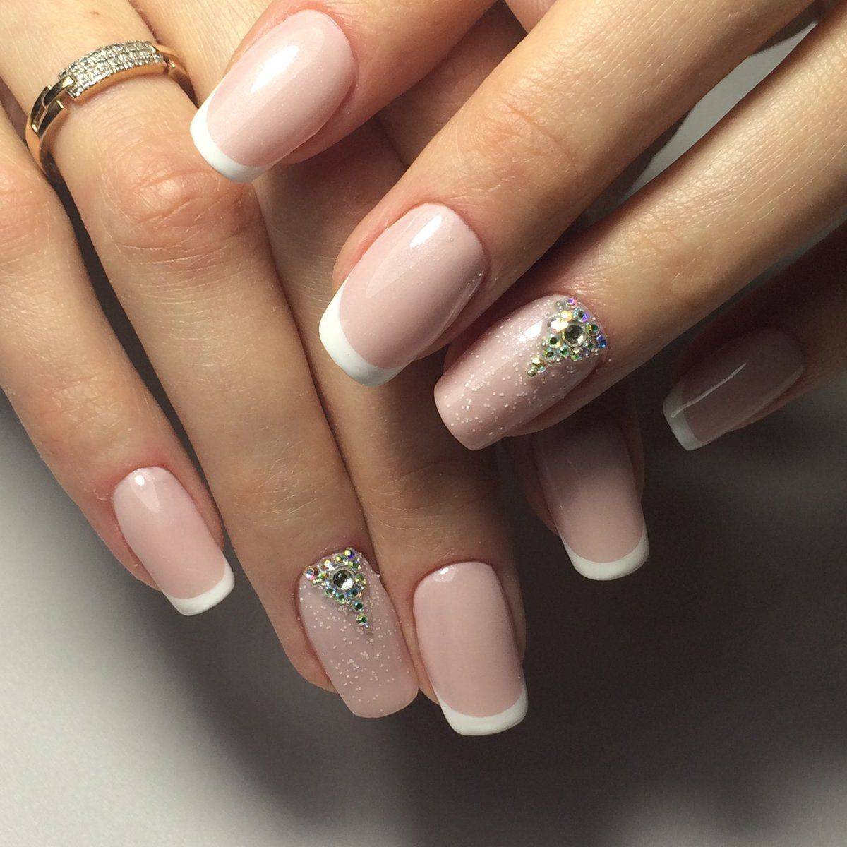 Обычно он дополняется кружевными узорами, флористическими мотивами, художественной росписью, стразами. Такой вариант всегда популярен, так как отличается скромностью и изяществом. Такой маникюр идеально подходит для длинных и средних ногтей. Классические оттенки – полупрозрачный розовый, бежевый, молочный, нюдовый.