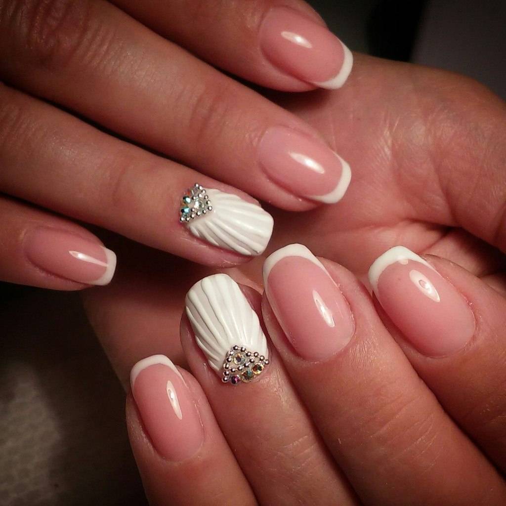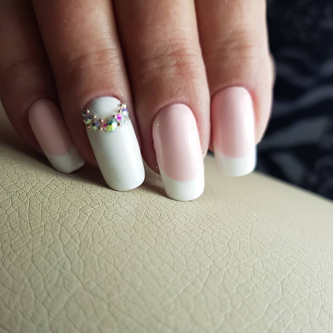 Празднично и ярко выглядит френч с декором со стразами или драгоценными камнями. Ногти с переливами сияющих элементов прекрасно будут сочетаться с аналогичными украшениями на корсете или прическе невесты. Блестящие камешки могут украшать границу между концом белой полоски и основным цветом. Красиво смотрятся стразы, рассеянные по большей части ногтевой пластины. Камешки могут украшать только безымянные палец. Такой френч со стразами на руках новобрачной будет смотреться нежно и романтично.