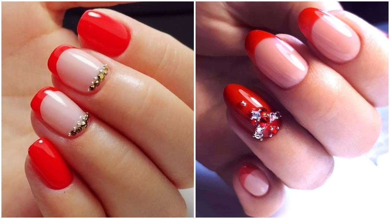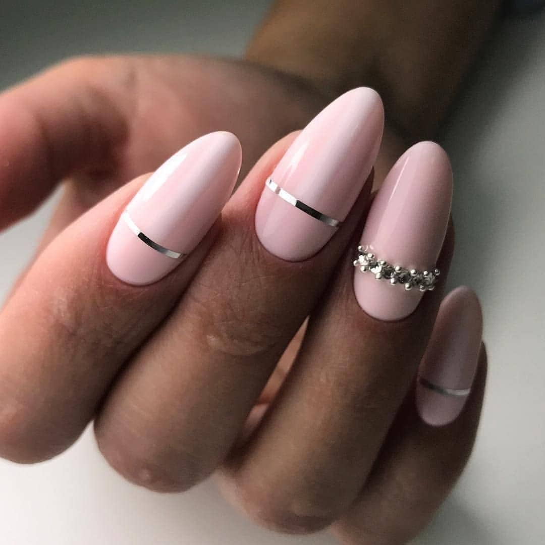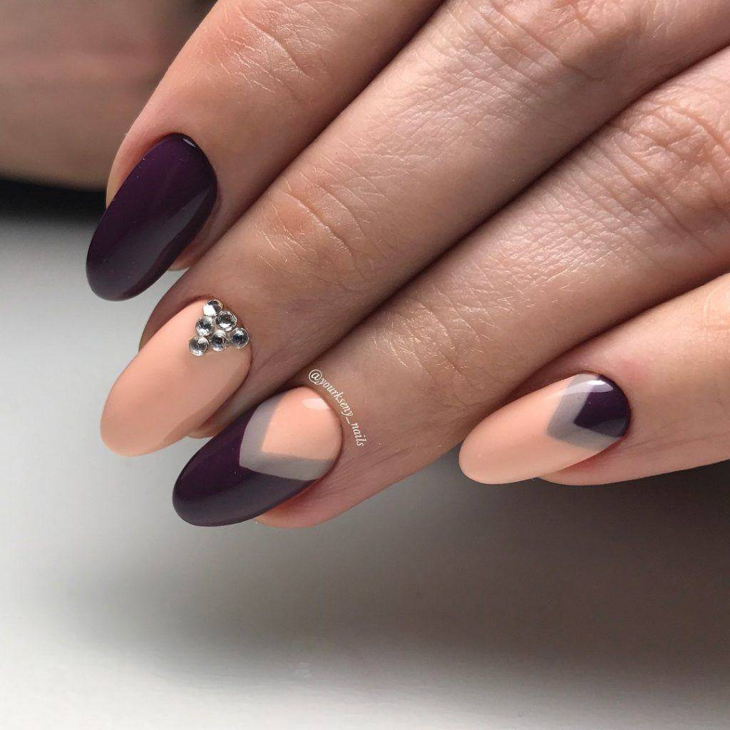 С помощью страз разделяют ноготь наполовину, покрывая одну из них подходящим цветом, а вторую оставляя натуральной.