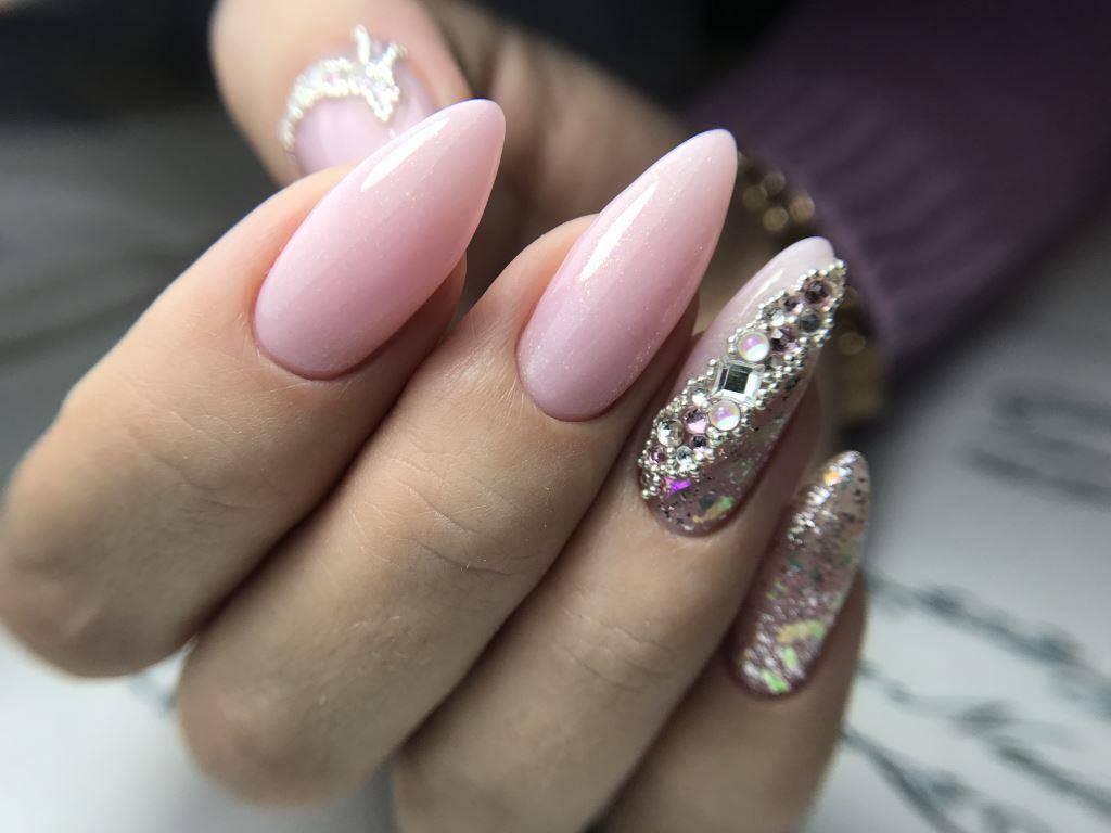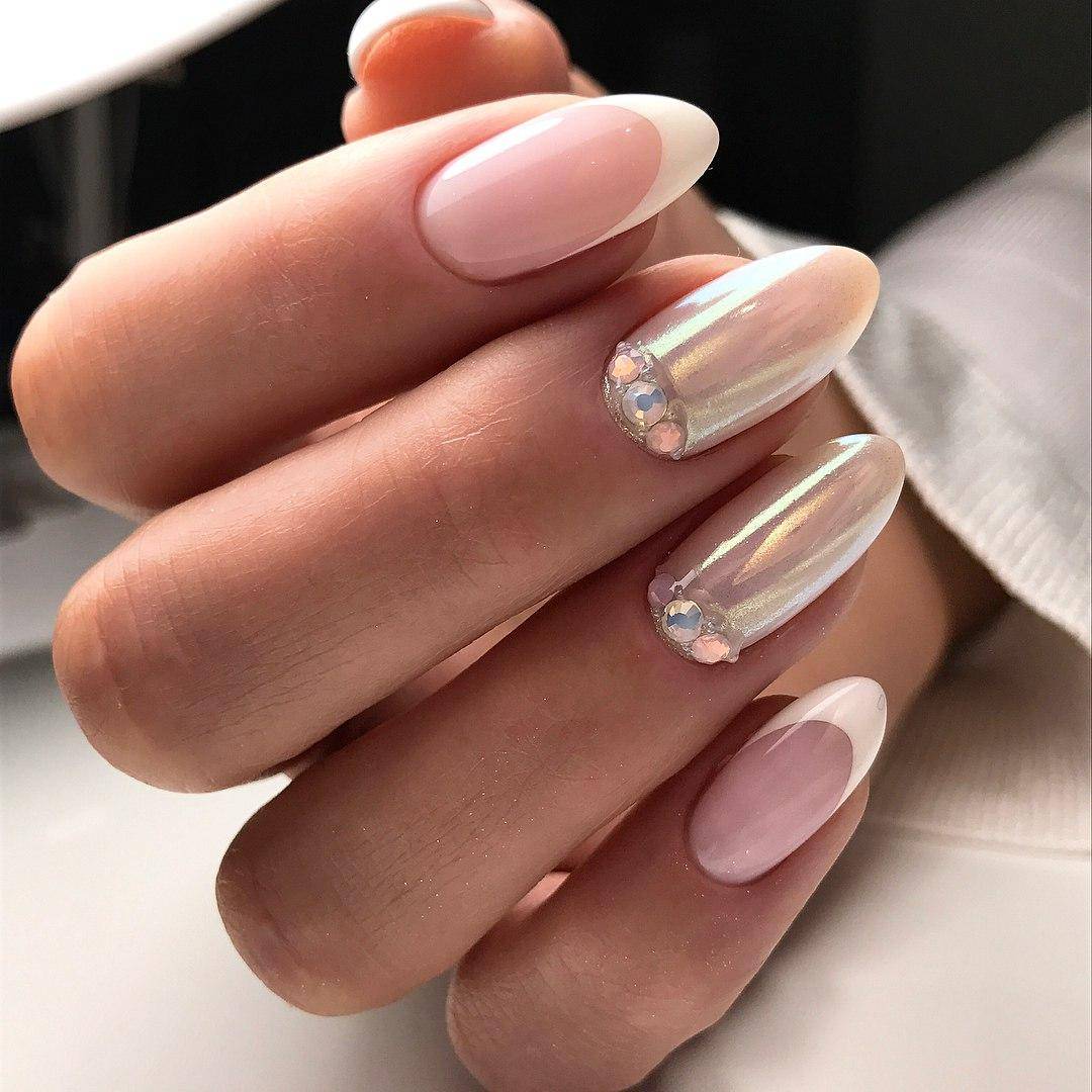 Редко какой маникюр на свадьбу обходится без страз или блёсток. Наряду с ними сейчас также популярен дизайн со слюдой, жемчуг и бульонки. Меняется только оформление ногтей.