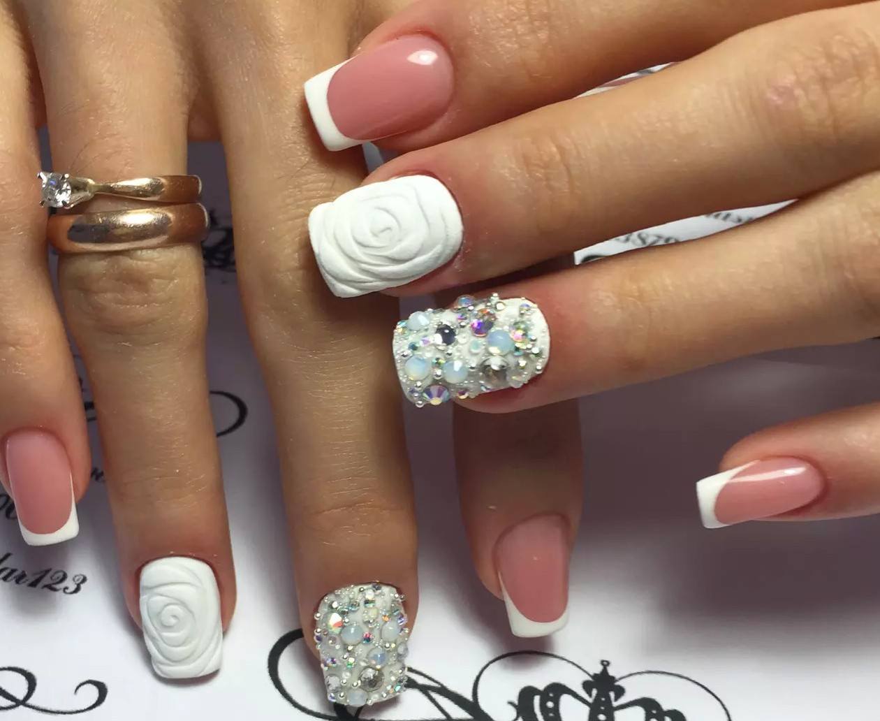 Красивый и оригинальный френч можно сделать с применением лепки. Объемные детали на пальцах новобрачной выглядят изысканно и нежно. Вариантов лепки множество, но нередко невесты хотят на руках видеть акриловые цветы. Если у вас тематическая свадьба, то красивое объемное изображение на ногтях может перекликаться со стилем торжества. Лепку делают из акриловой пыли.