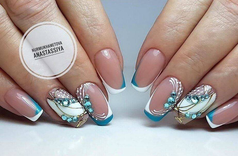 - Правильно и разумно распределите все используемые цвета. Для утонченности маникюра мастера советуют использовать больше бирюзовых оттенков.