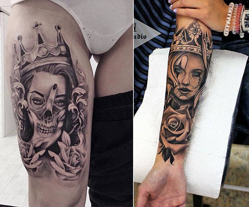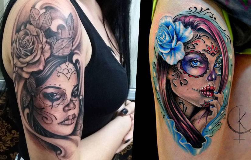 Изображение лица девушки чикано. Лицо девушки часто украшает маска-череп, отсылающая к мексиканским верованиям о хранительнице жизни и смерти – дерзкой женщине, владеющей магией, властью над мужчинами. Обычно, набивается на плечо. Креативно выглядит тату чикано на ноге.