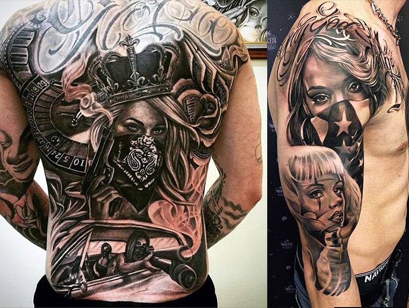 - Женские портреты. Портреты в стиле чикано сложно перепутать с какими-либо другими. На них изображены не просто молодые милые дамы, а дерзкие красотки с вызывающим взглядом, часто с оружием в руках и лицами, скрытыми под масками. Такие изображения чаще всего носят лишь декоративный характер и требуют достаточно много места, поэтому портреты размещают в основном на бедре, плече, спине или груди.