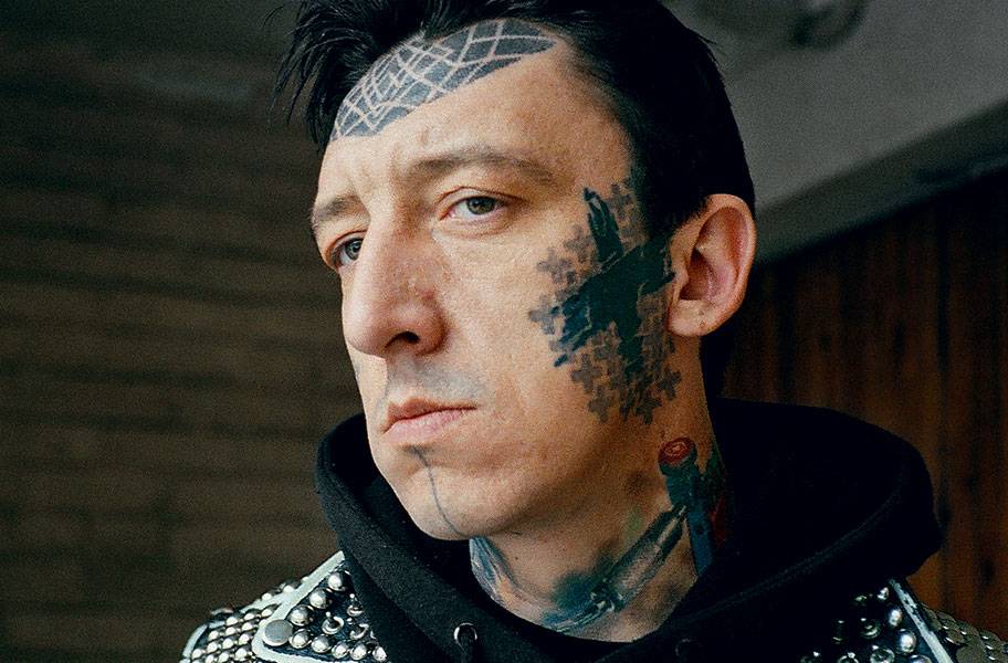 Фейс — российский рэпер. Лицо украсил надписями, кинжалом, сердцем, слезами.