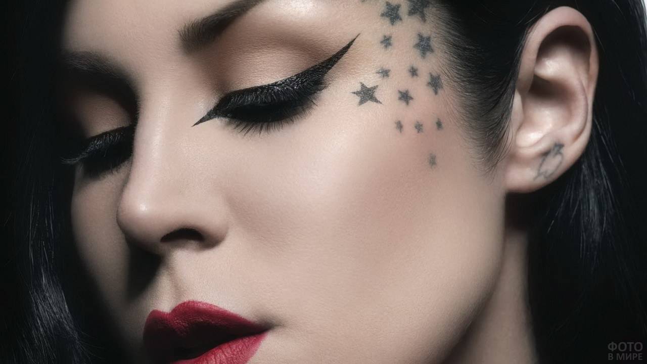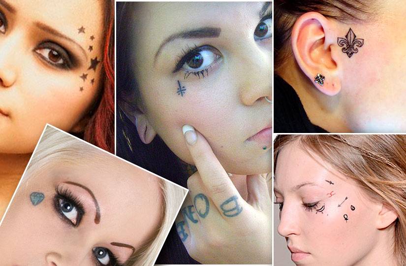 Маленькие тату на лице для девушек особенно популярны, ведь они сильно не меняют имидж, хотя и вносят перчинку в образ. При необходимости, такие татуировки можно легко скрыть под макияжем.
