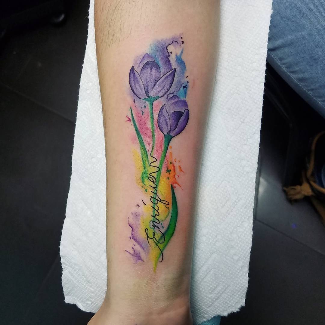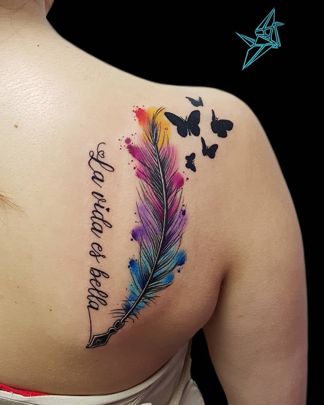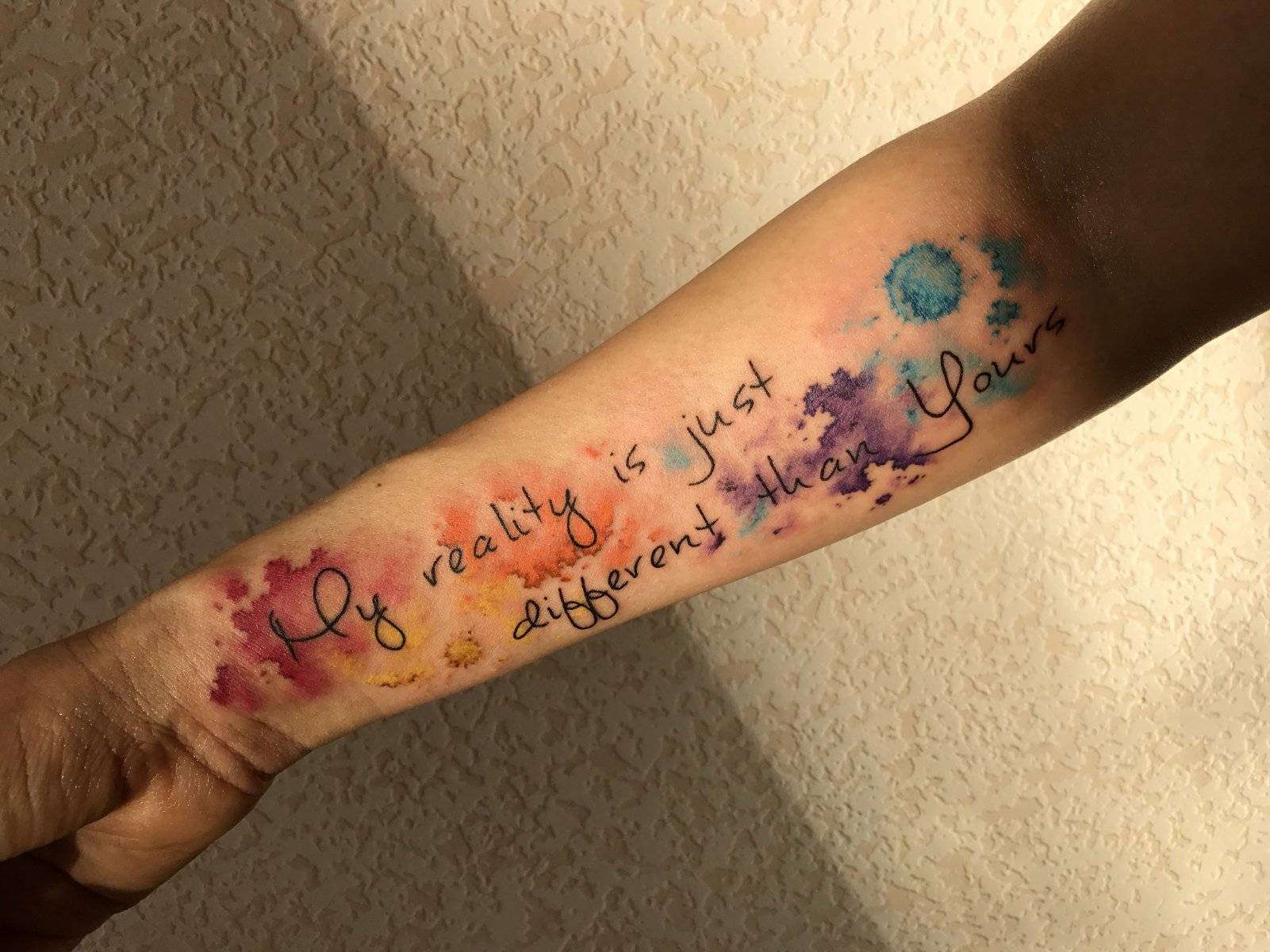 В надписи для тату можно добавлять яркие краски: это сделает их еще более модными, а также вдохнет жизнь в простые иероглифы.