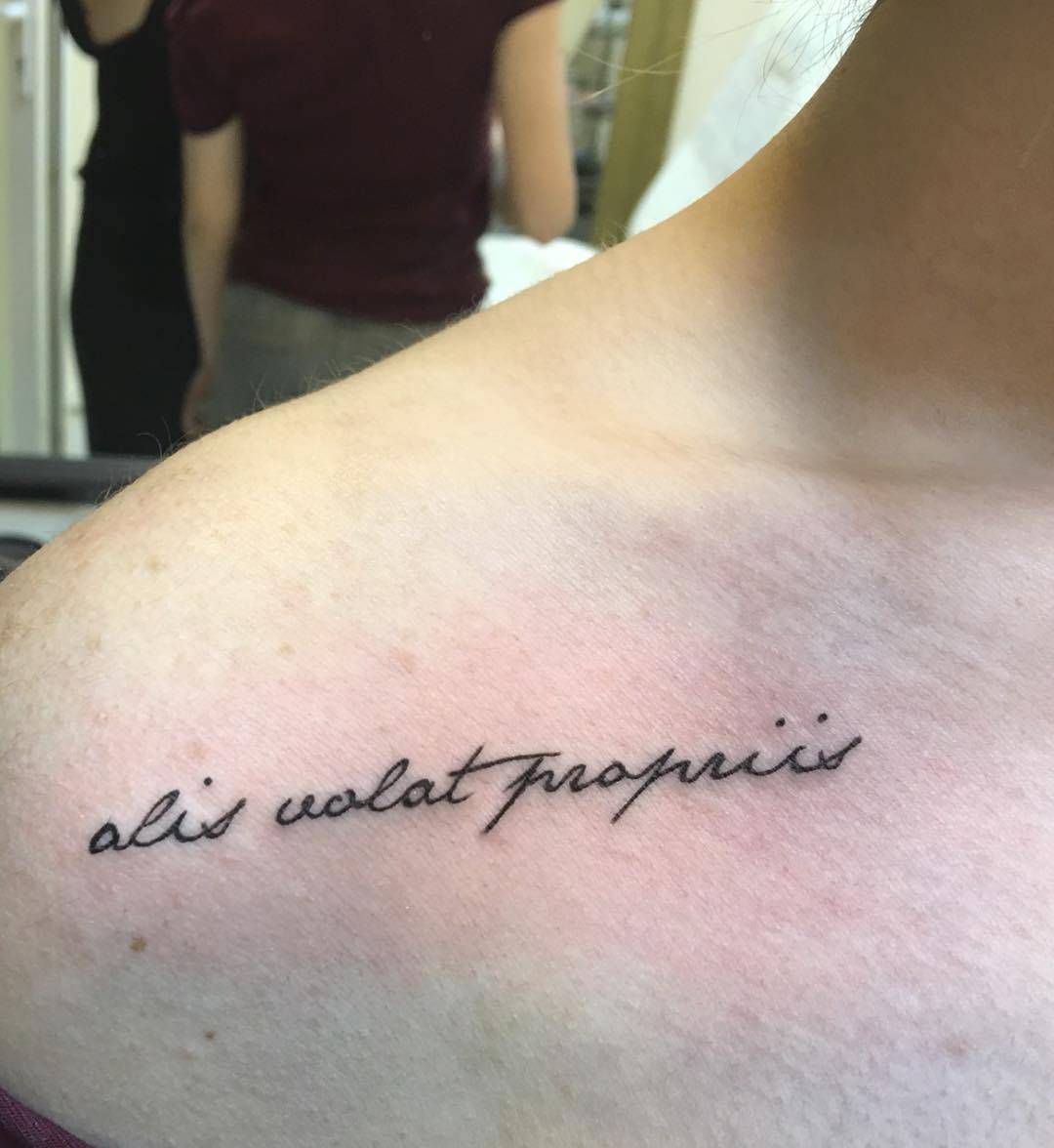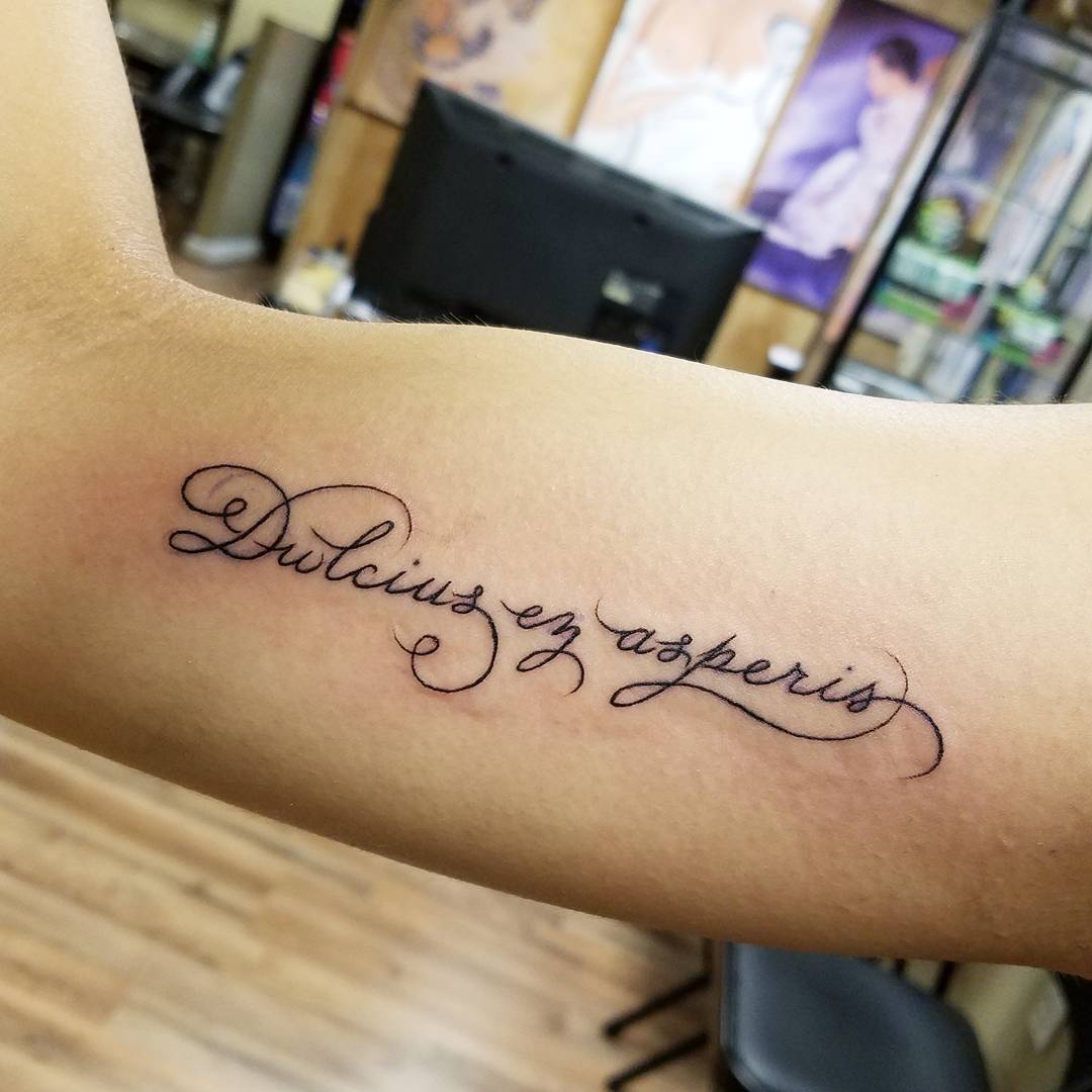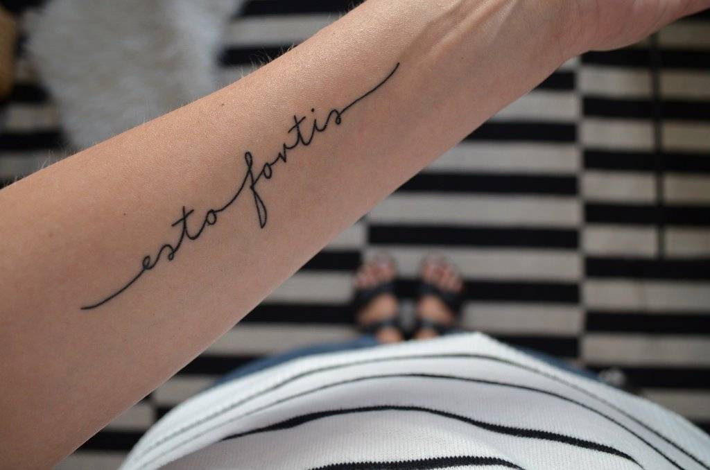 После выбора фразы на латыни, выбирается стиль и цвет. Чаще, девушки предпочитают более изящную, витиеватую каллиграфию, наполненную вензелями и узорами. Брутальный стиль крупных, грубых шрифтов – выбор большинства мужчин. В настоящее время количество стилей надписи растет с каждым днем. Поэтому подобрать индивидуальный почерк становиться легче.