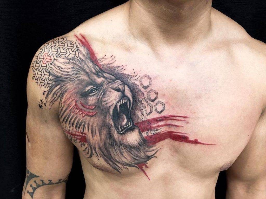 Мужчины редко используют этот стиль в качестве самостоятельного. Имитацию акварели применяют в качестве фона под более четкие рисунки в стиле скетч или графика. В классическом варианте стиль предполагает все три оттенка: красный, синий и фиолетовый. Но для мужских тату допускается использование черного пигмента, помогающего создать особый визуальный эффект.