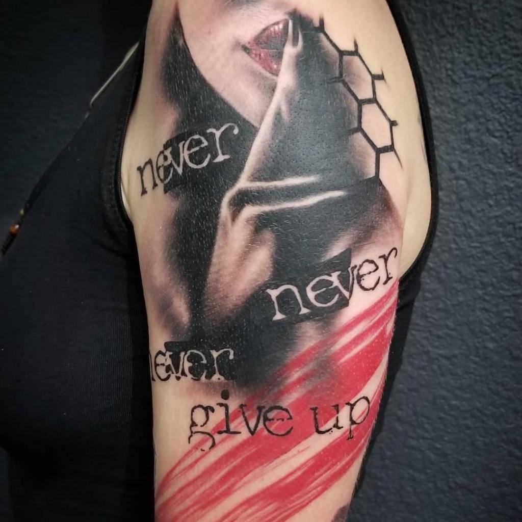 Трэш Полька тату эскизы – это возможность дополнить нательную картину элементами дружественных жанров (дотворк, реализм, лайнворк), глубокомысленными надписями печатным шрифтом. В результате татуировка ассоциируется с визиткой владельца, сообщая о его политической позиции, музыкальных пристрастиях, религиозных предпочтениях.