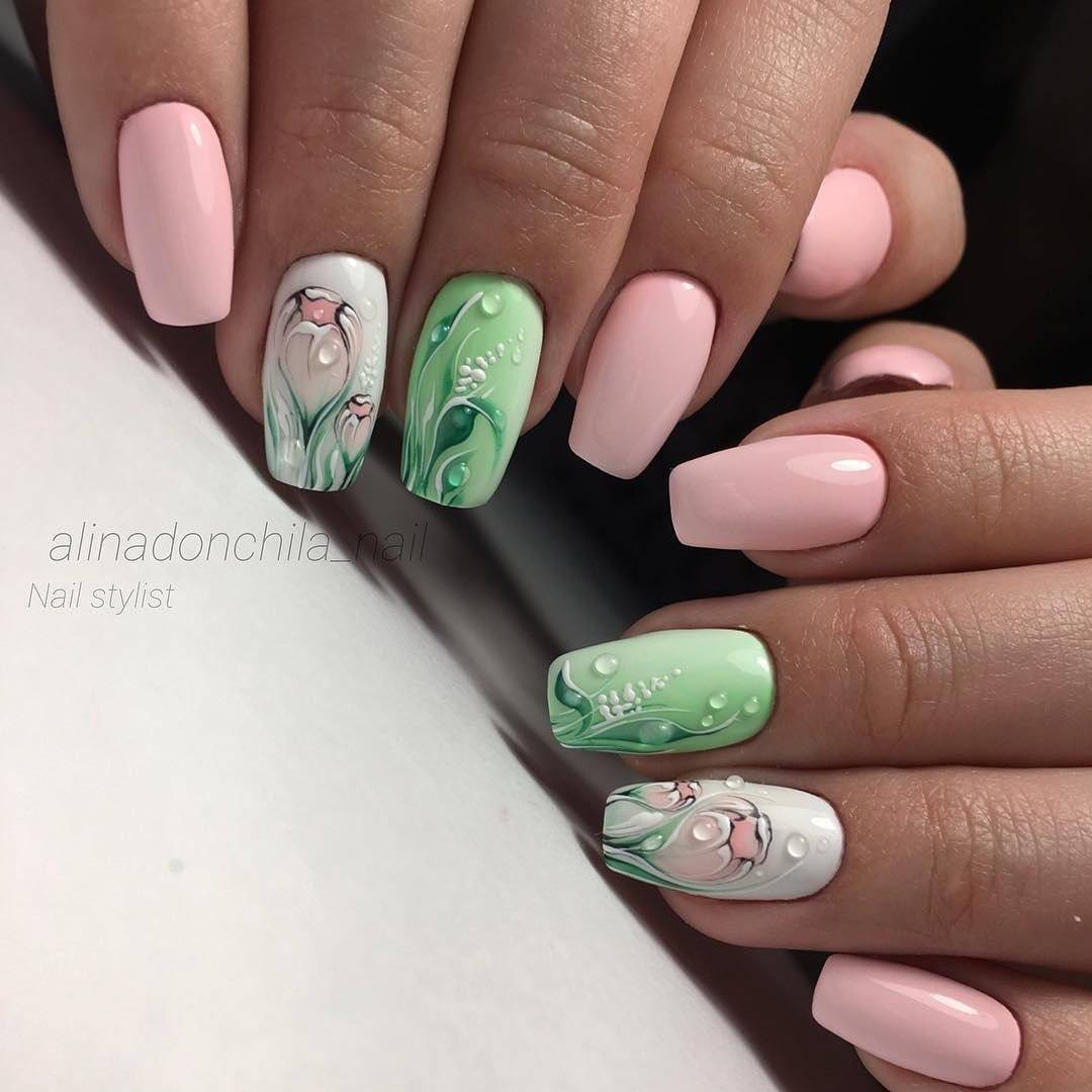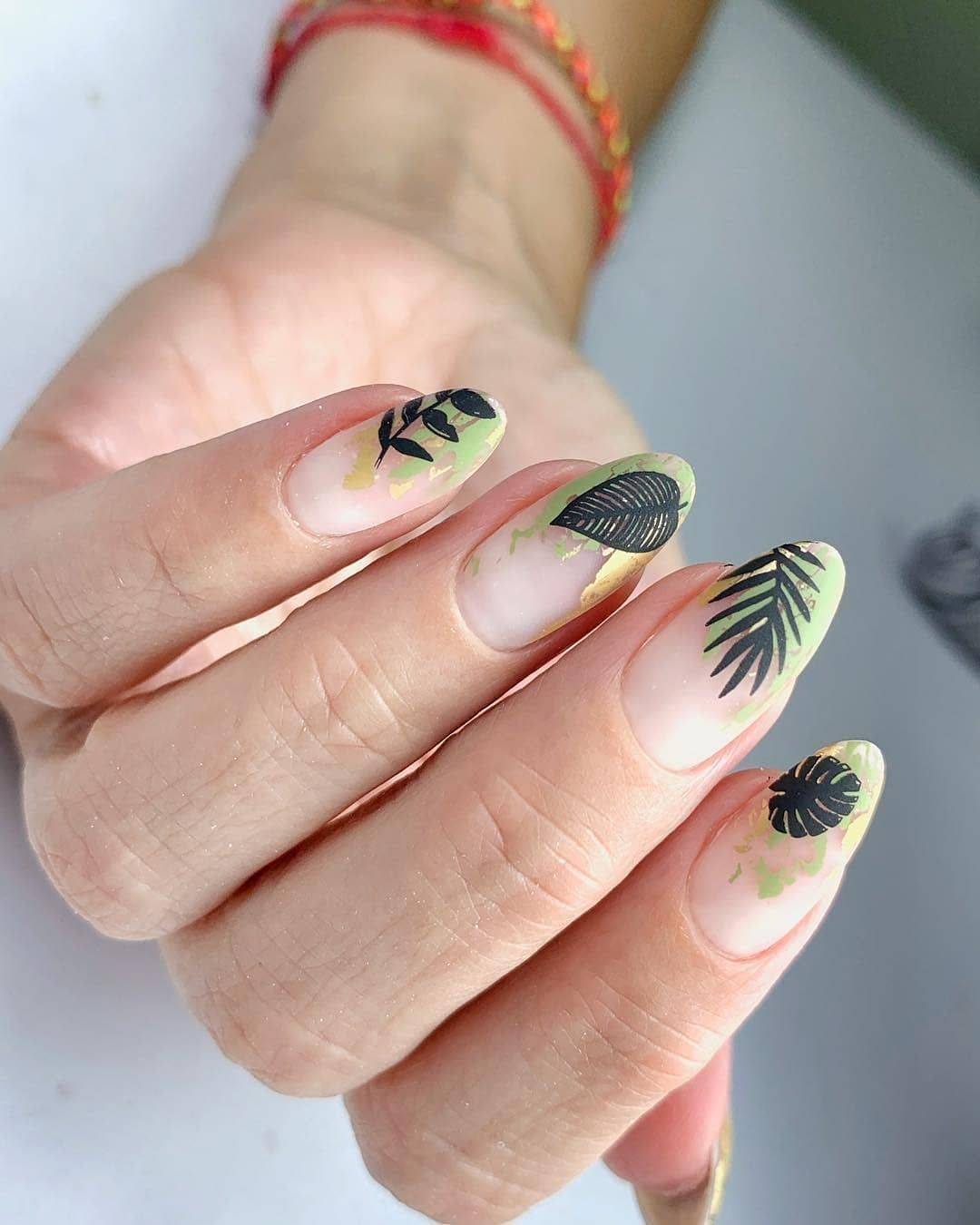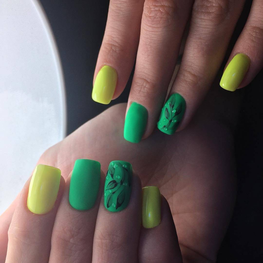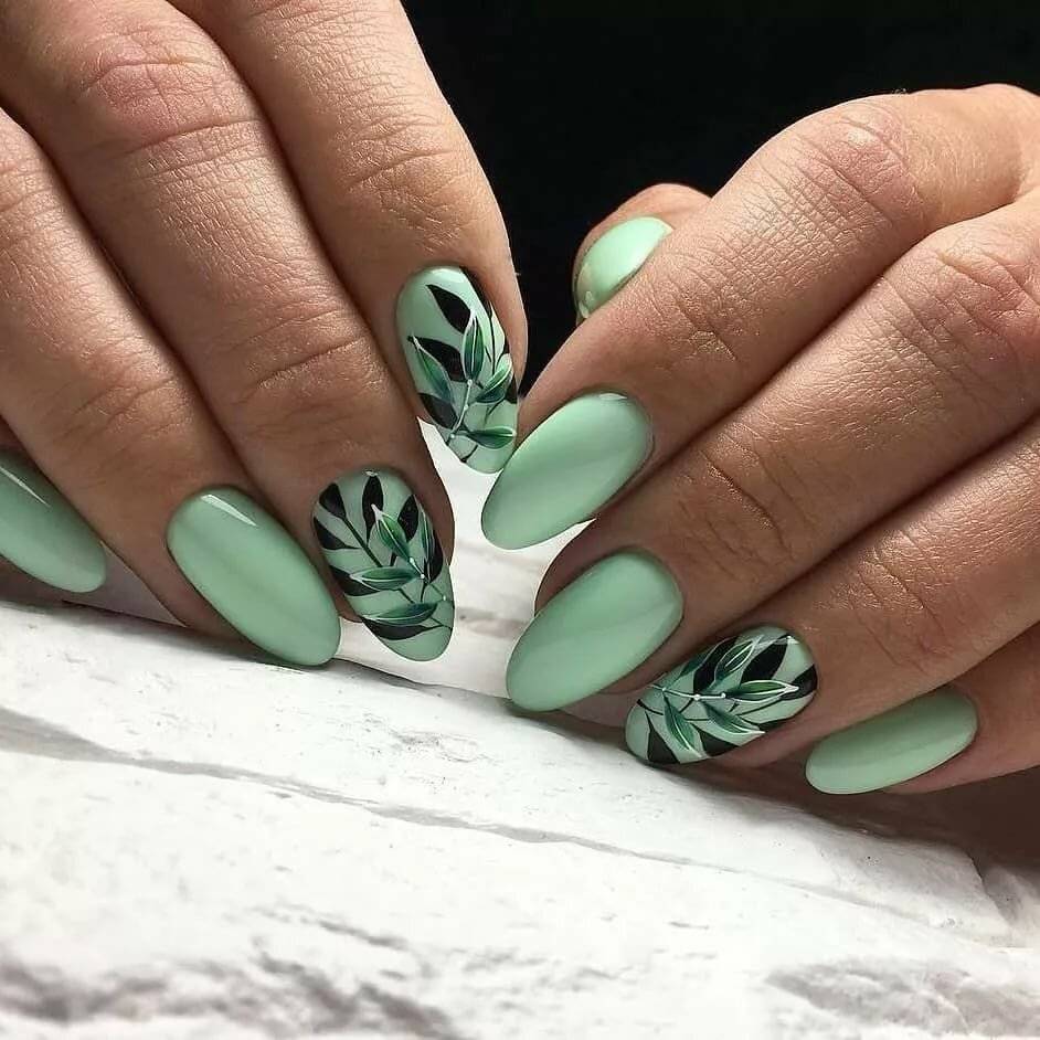Зелёный цвет насчитывает множество видов, и каждый оттенок этой палитры обладает особенными качествами, ведь примеси коричневого, синего или жёлтого волшебным образом изменяют его визуальное восприятие. Лазурный и мятный, например, станут идеальным выбором для создания дизайна ногтей в морском стиле. Для дизайна с малахитовым зелёным в матовом исполнении предпочтительно использовать светлые тона, а для глянца идеальным решением будут тёмные оттенки.