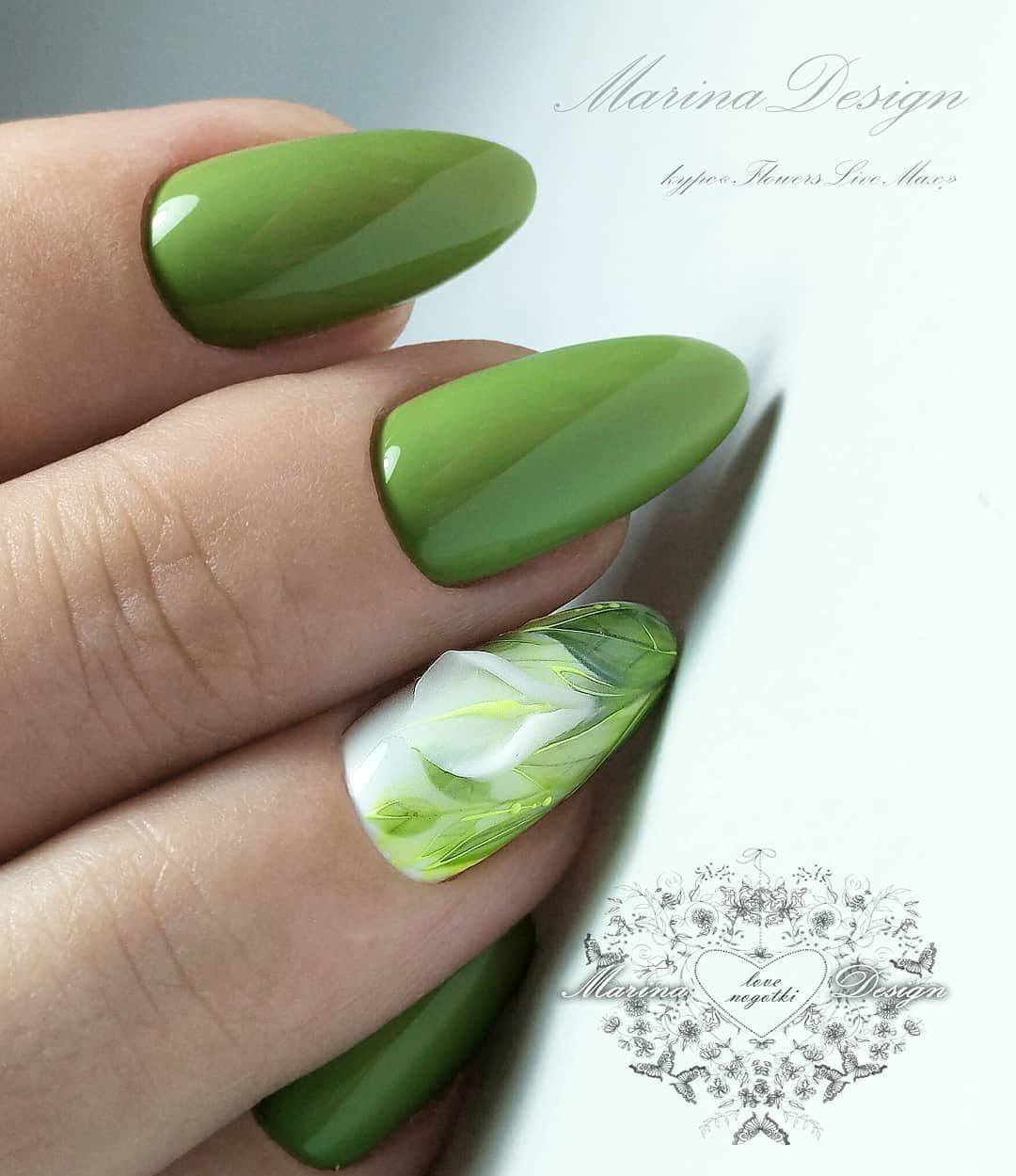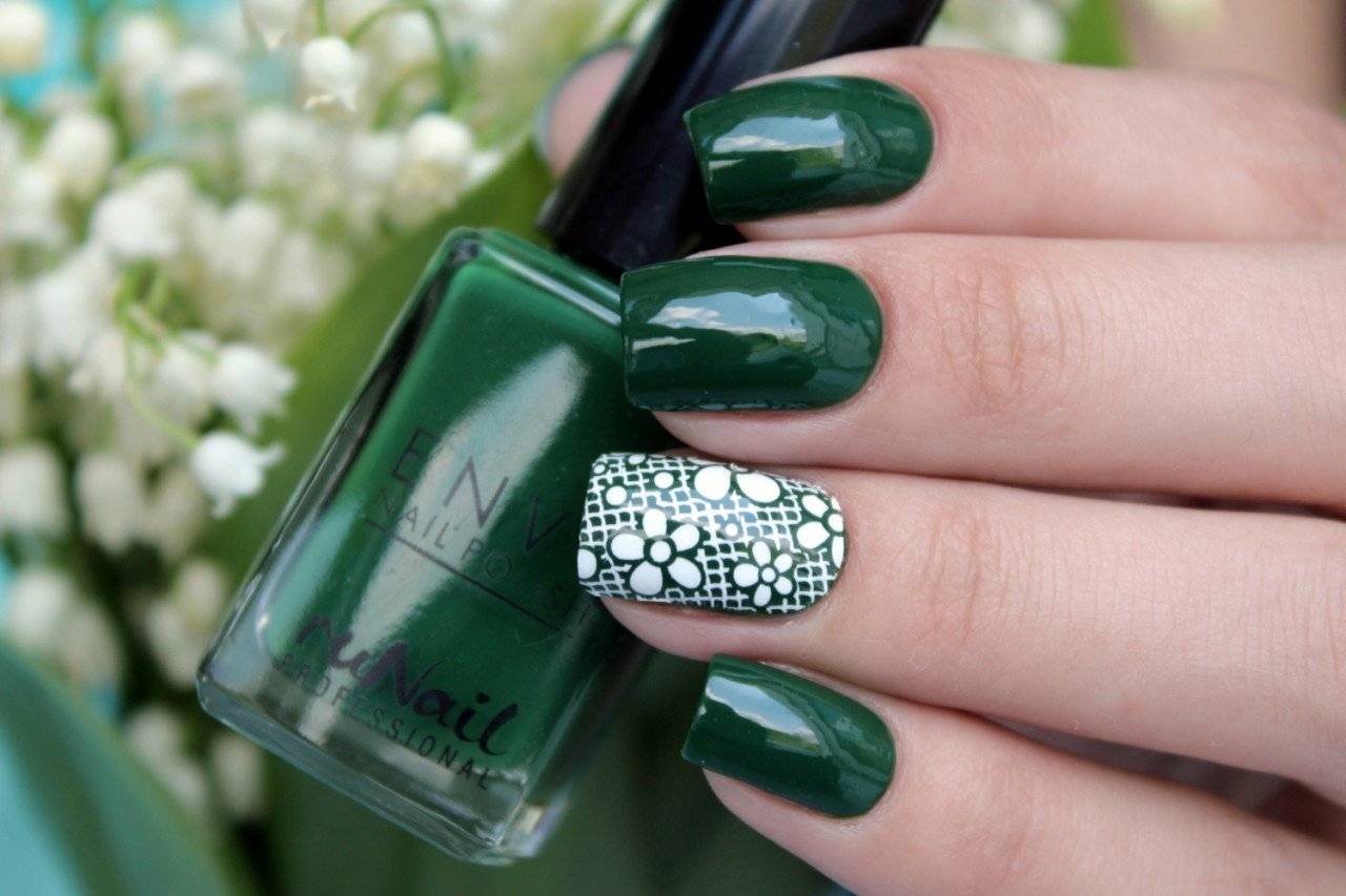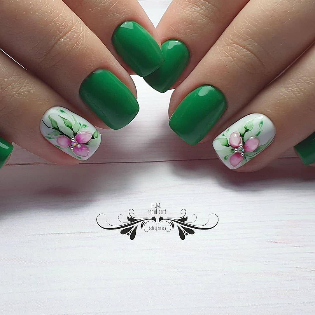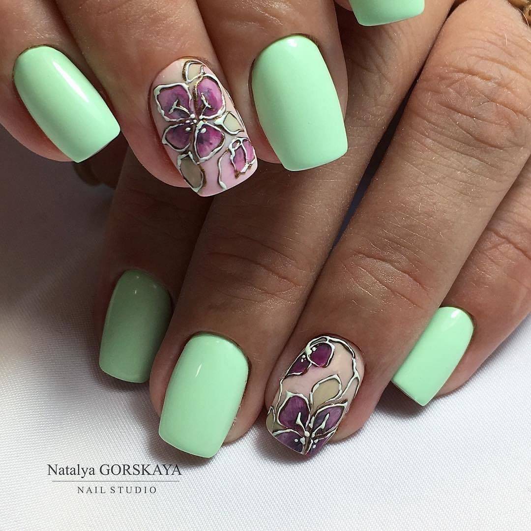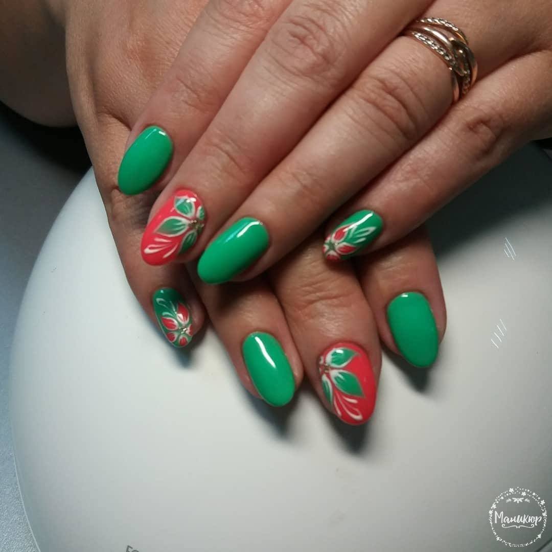 Чтоб выполнить яркий и гармоничный маникюр, мало окрасить его зеленным цветом, необходимо использовать дополнительный декор. Самым лучшим вариантом станут соответствующие цветочные узоры. Яркие и удивительные цветы получатся в технике витраж. Выполнять витражные рисунки лучше всего на темно-зеленом фоне