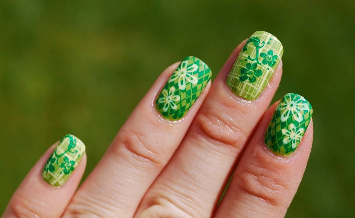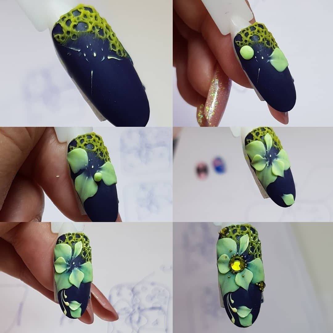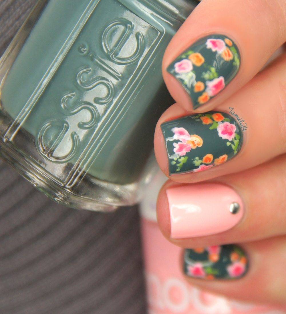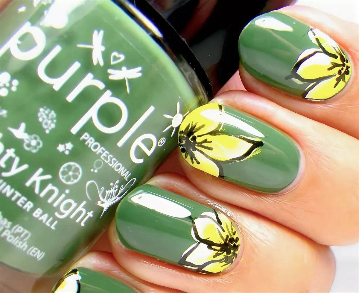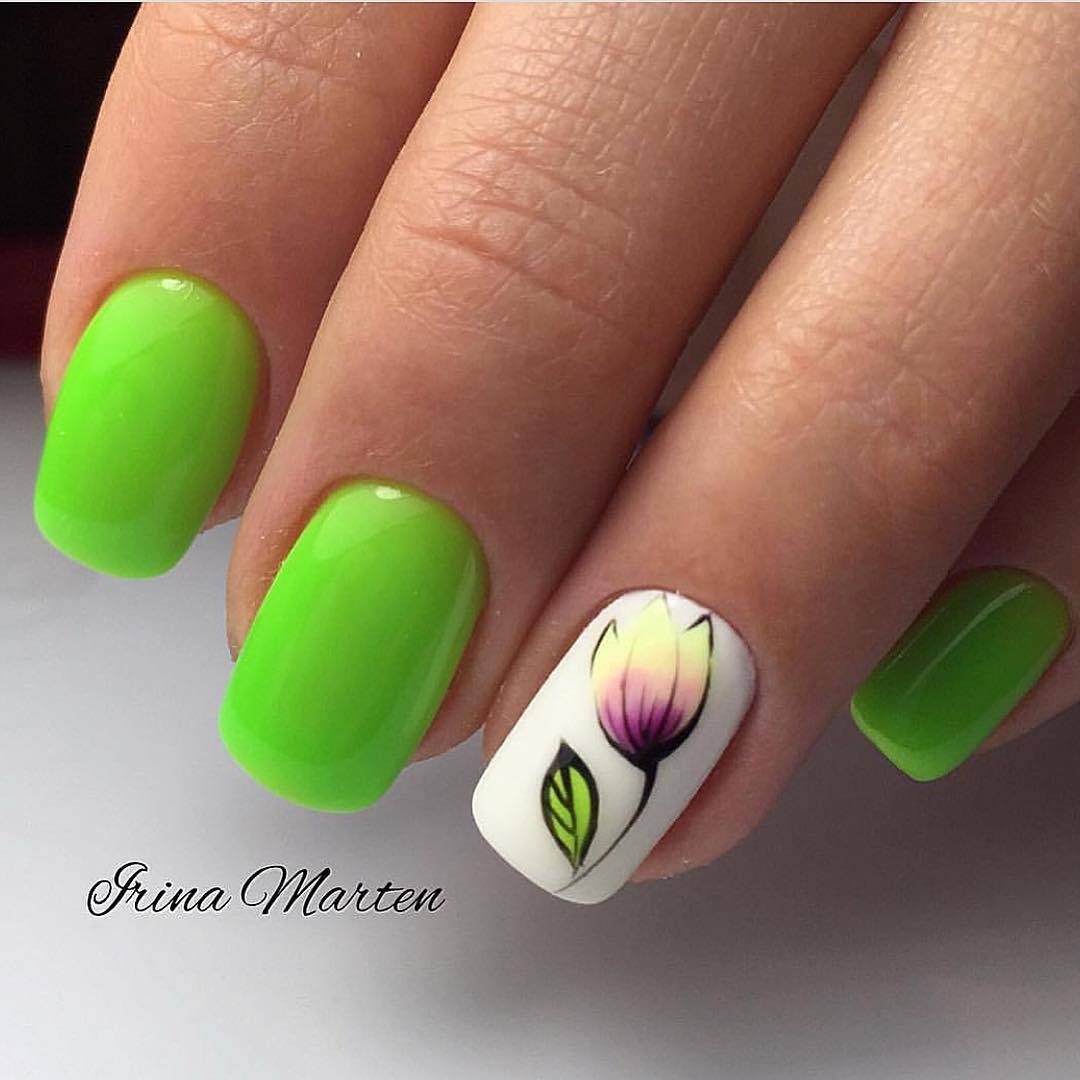 Чтоб выполнить яркий и гармоничный маникюр, мало окрасить его зеленным цветом, необходимо использовать дополнительный декор. Самым лучшим вариантом станут соответствующие цветочные узоры. Яркие и удивительные цветы получатся в технике витраж. Выполнять витражные рисунки лучше всего на темно-зеленом фоне