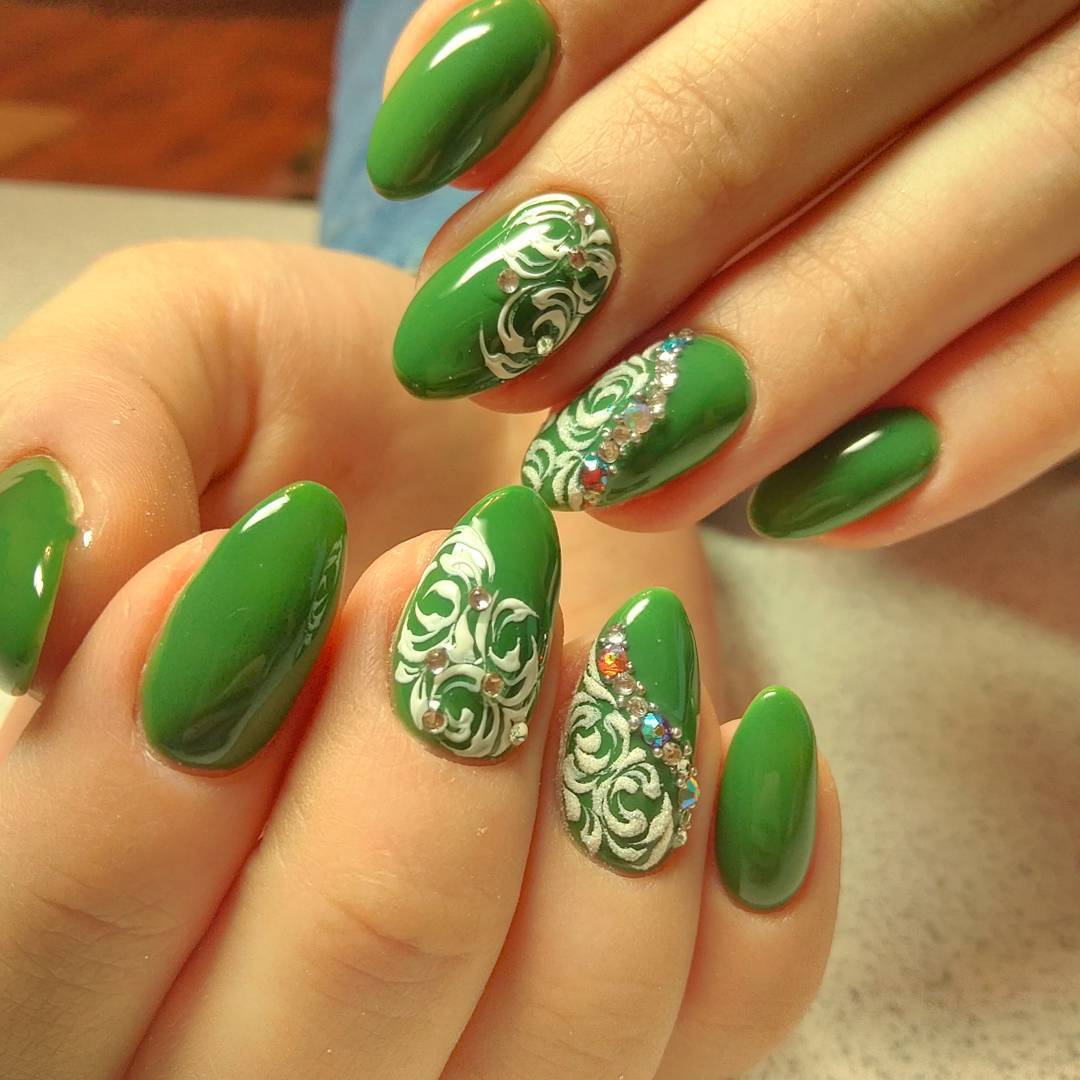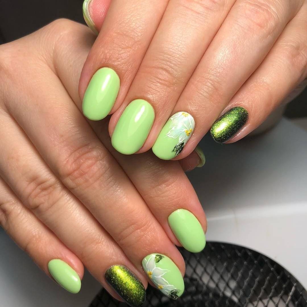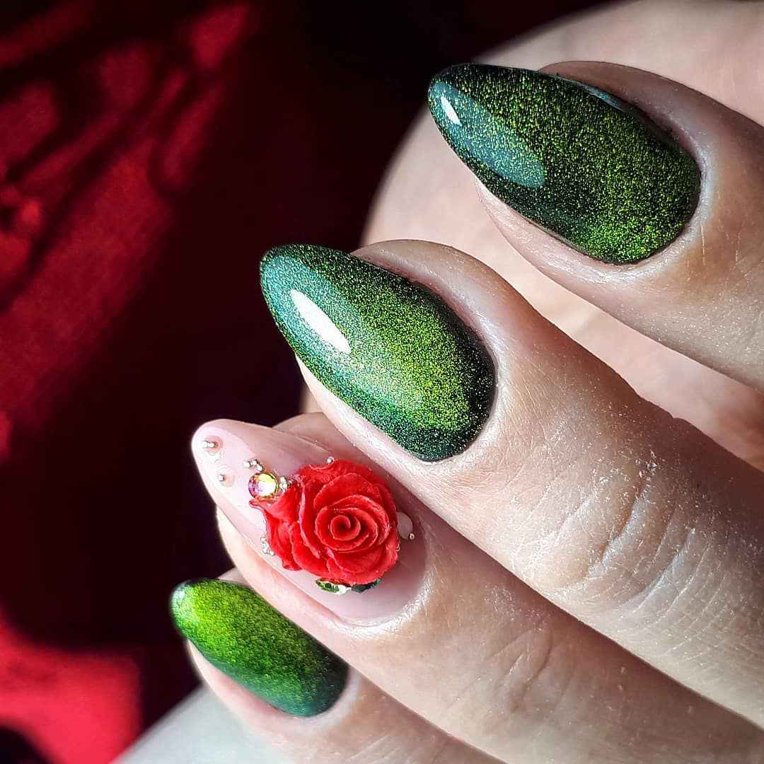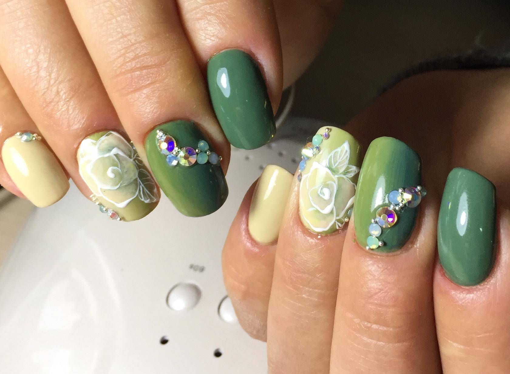 Изумрудный зелёный можно сочетать на ногтях с «кошачьим глазом». Ногти средней длины или длинные пластины смотрятся с изумрудным наиболее привлекательно. Оригинальный салатовый станет чудесным решением на каждый день. Оливковый максимально проявляет себя в однотонном маникюре. Нескольких золотистых деталей для таких ноготков будет вполне достаточно. Оттенки в стиле хаки или «камуфляж» можно обыгрывать в самых разных вариациях оформления.