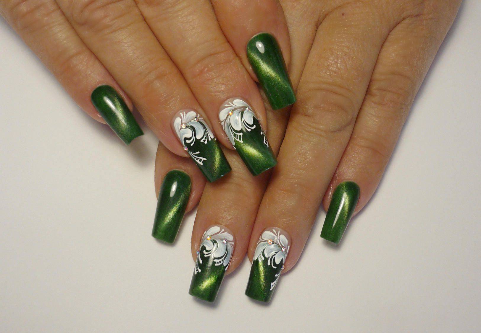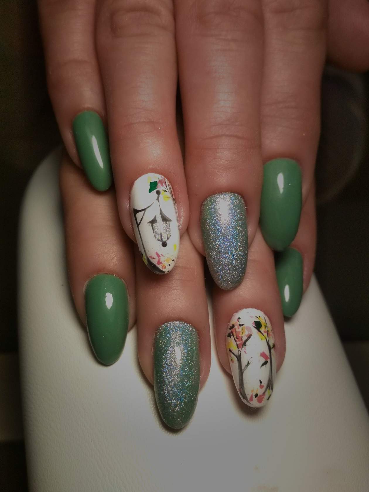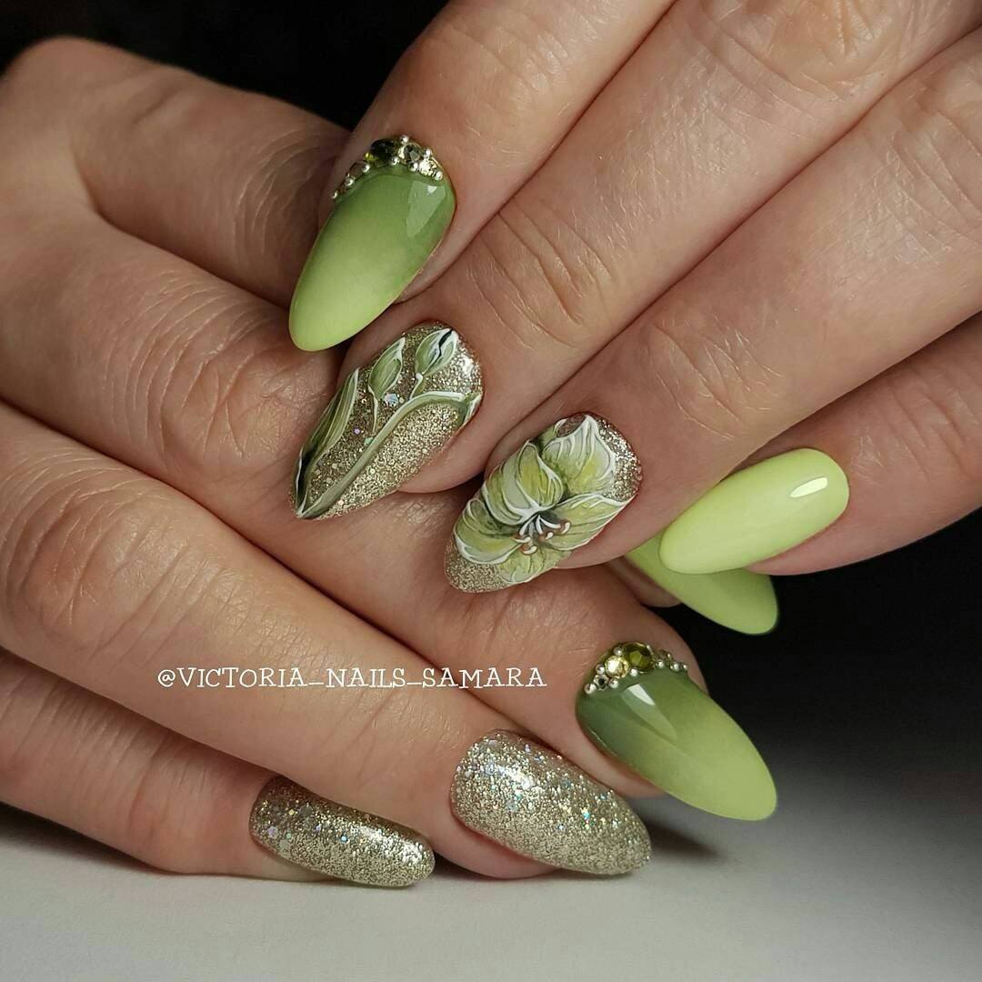 Изумрудный зелёный можно сочетать на ногтях с «кошачьим глазом». Ногти средней длины или длинные пластины смотрятся с изумрудным наиболее привлекательно. Оригинальный салатовый станет чудесным решением на каждый день. Оливковый максимально проявляет себя в однотонном маникюре. Нескольких золотистых деталей для таких ноготков будет вполне достаточно. Оттенки в стиле хаки или «камуфляж» можно обыгрывать в самых разных вариациях оформления.
