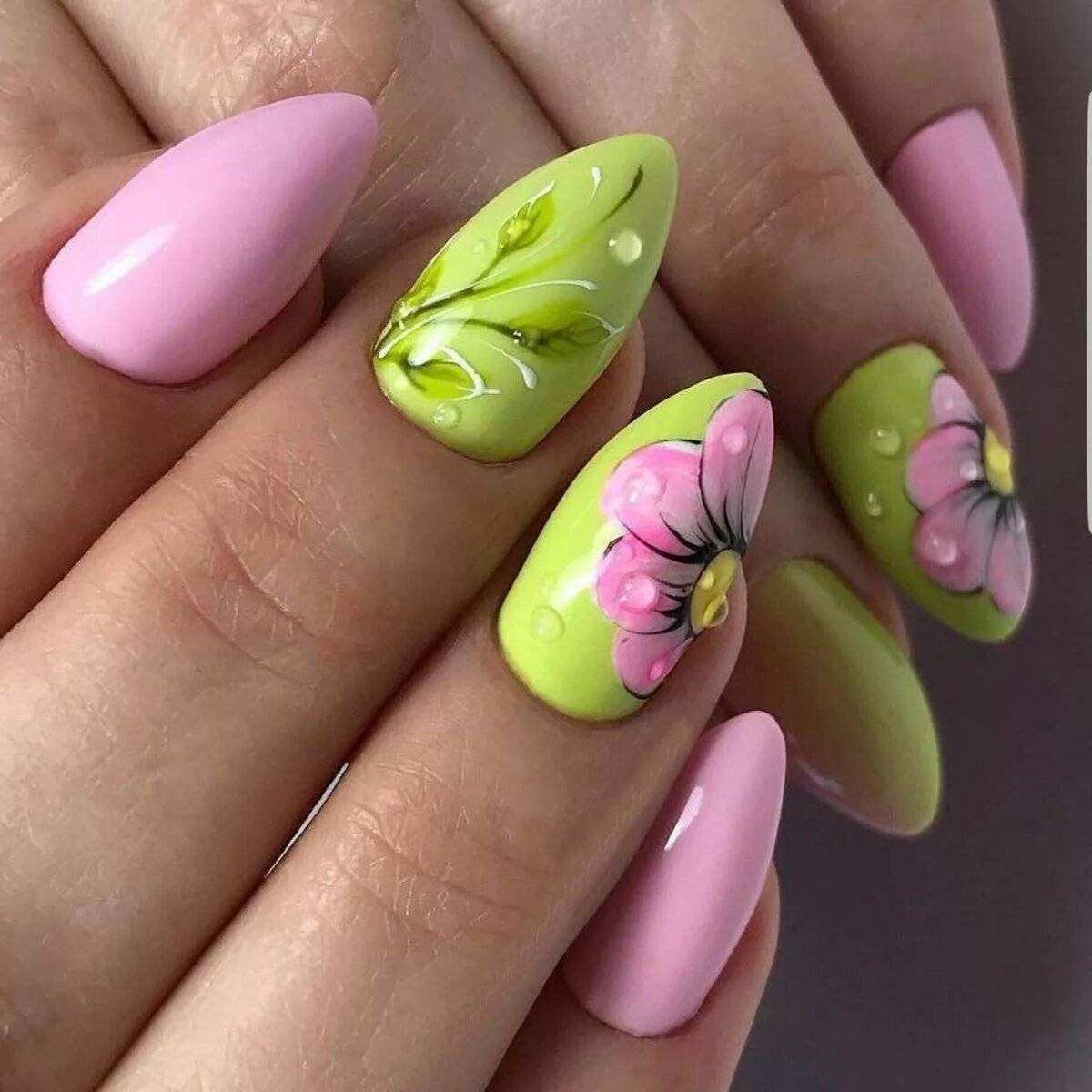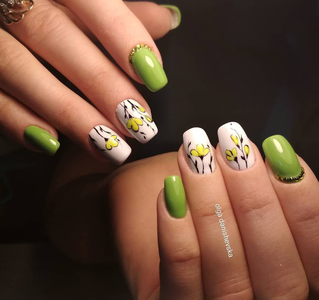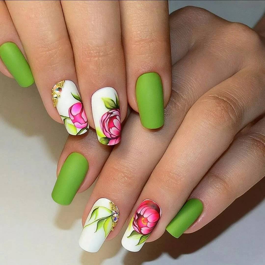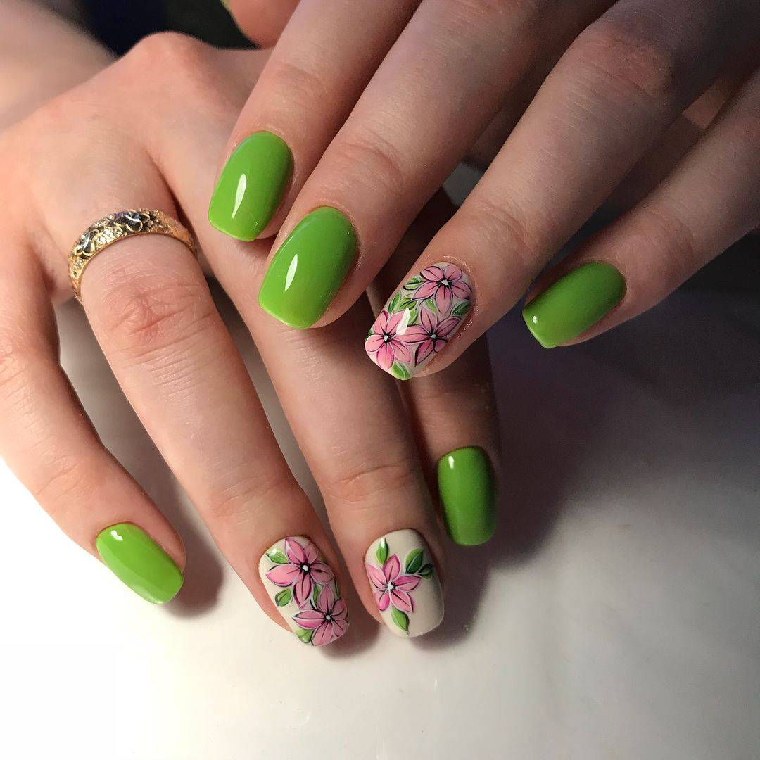 Зеленый маникюр с цветами пользуется невероятной популярностью среди ярких и неординарных особ. Такой маникюр в сочетании с цветочными рисунками создает невероятную композицию. Фантастический маникюр в зеленой палитре можно смело сочетать с другими цветами, а также применять декор в виде страз, бусинок, камифубуков, конфетти и глиттера. Нежный и невероятный дизайн утонченно впишется в различные образы и подчеркнет изящность и неординарность девушки.