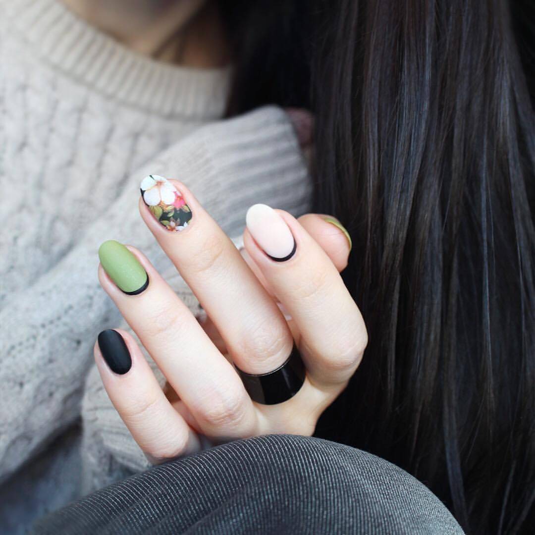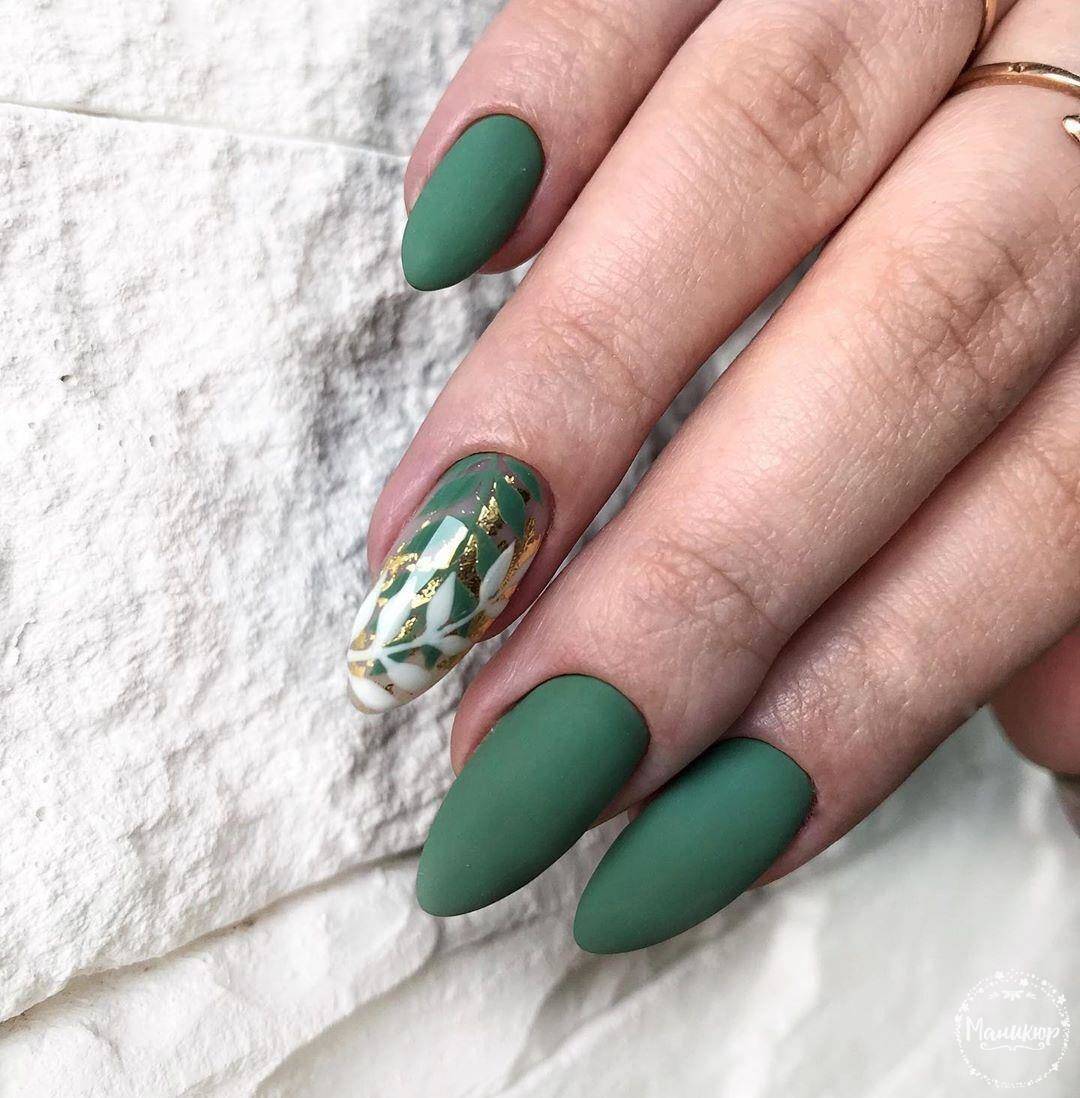 Бархатный зеленый маникюр особенно популярен в весенних и летних образах. Дизайн источает утреннюю свежесть, безмятежность и уют. Используйте для матового покрытия яркие светлые оттенки зеленого. Особенно красиво выглядит однотонный мятный дизайн с темной флористикой на безымянном пальце.