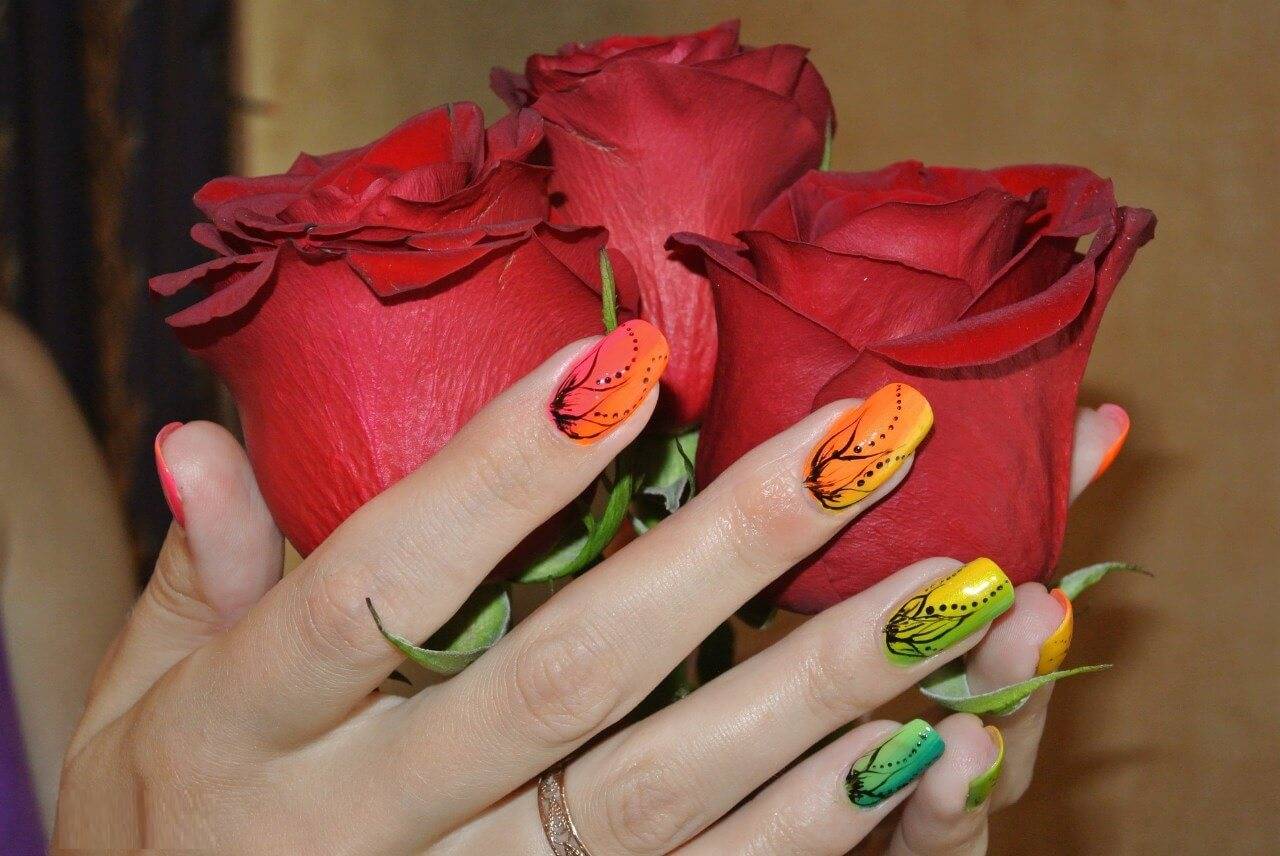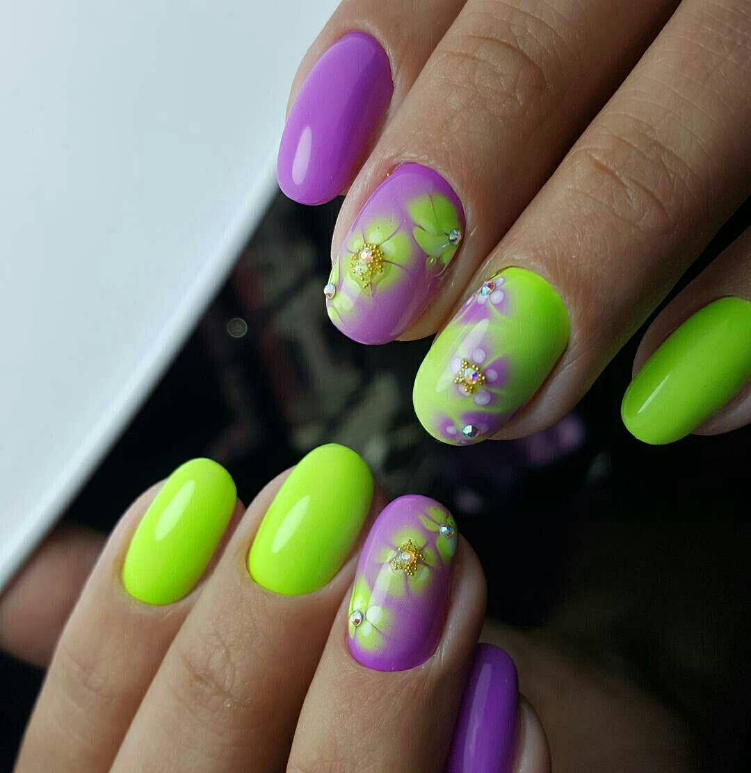 Каким бы разноцветным маникюр не был, в большинстве случае, в его цветовой гамме обязательно будет присутствовать зеленый цвет того или иного оттенка. Самым распространенным разноцветным дизайном является окрашивание отдельных ноготков в разные цвета. Также можно сделать разноцветный градиент.