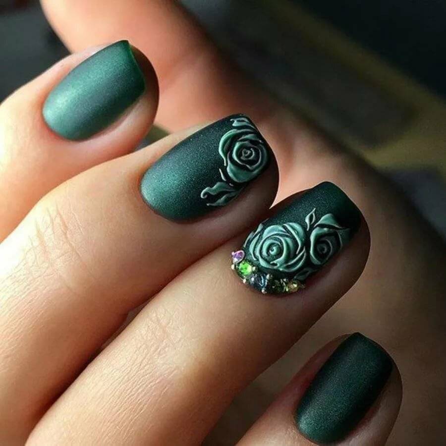 Выполненный в светлых оттенках, например, весенней зелени, бирюзы, мяты, он будет смотреться нежно, а в насыщенных темных, например, морской зелени или нефрита, маникюр визуально будет похож на дорогой шикарный бархат.