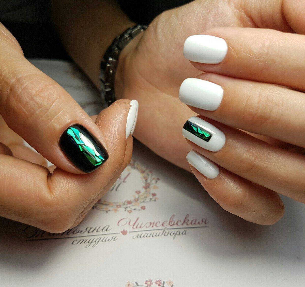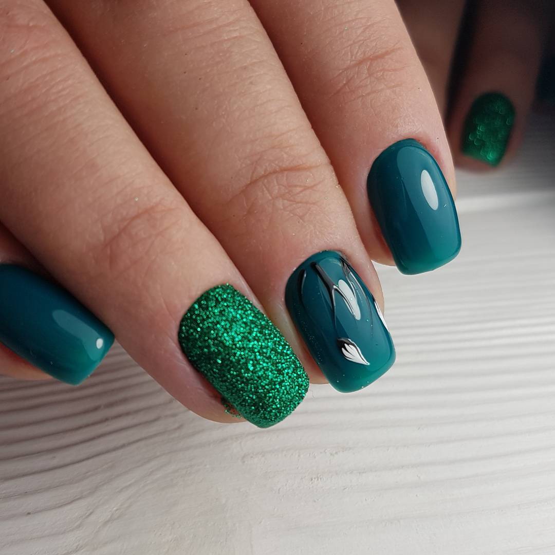 Не менее эффектно на ногтях смотрится контрастная композиция зелёной палитры и чёрного лака, которую можно обыграть в самых разных интерпретациях. Как и в предыдущем предложении, тандем чёрного и зелёного очень красиво смотрится во французском стиле, в компании с разнообразными узорами и принтами, а также с различными видами декорирования. Среди интересных идей украшение акцентного ногтя бусинами, прорисовка деталей рисунков штрихами глиттера и расположение у основания ногтевой пластины сверкающих кристаллов в тон покрытию.