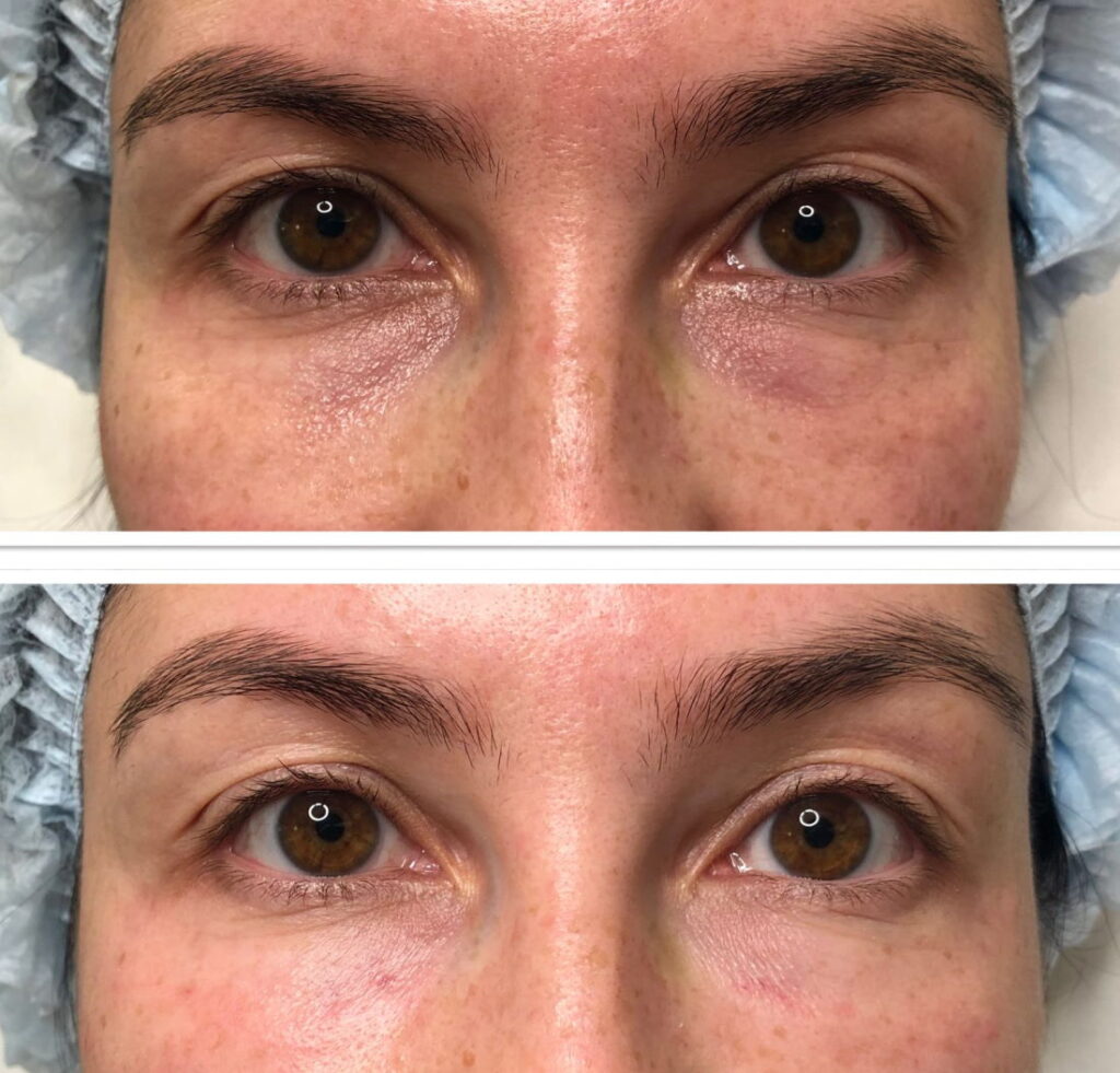 По 0,1 мл (два болюса по 0,05 мл) соответственно с каждой стороны введено в латеральную порцию глубокого подглазничного жирового компартмента с целью создания красивого скулового вектора.