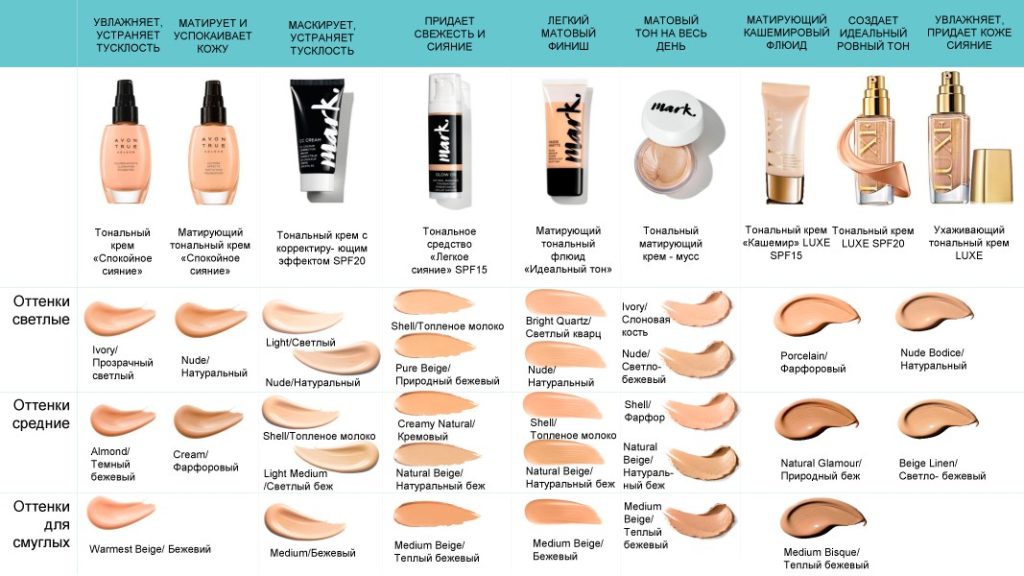 Тональные кремы Эйвон Марк – это разнообразие видов, оттенков и свойств. От плотных матирующих средств до легчайших флюидов и сияющих хайлайтеров.