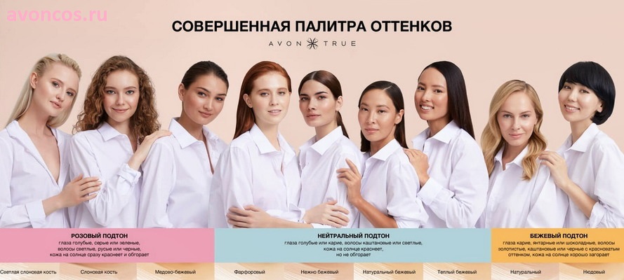 Широкая градация оттенков разбита на три подтона : бежевый, нейтральный и розовый, в каждом подтоне есть оттенки от светлого до темного. А в каталоге Avon размещена удобная цветовая палитра оттенков , осталось только приложить к шее и оценить, насколько тон подходит тебе при естественном освещении.