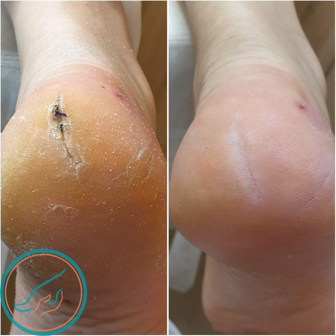 Глубокие трещины на пятке, до и после обработки в Центре подологии
