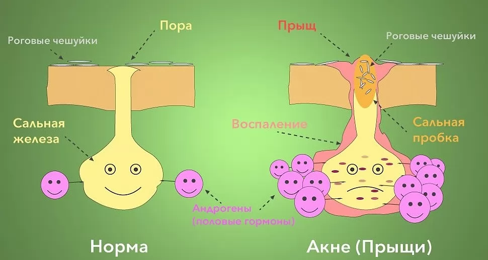 Одним из главных эндогенных факторов являются гормональные изменения, и в первую очередь -гиперандрогения (избыток тестостерона). Наиболее часто акне возникает у юношей на фоне гормонального всплеска в период созревания, а также в предменструальном периоде у девушек.