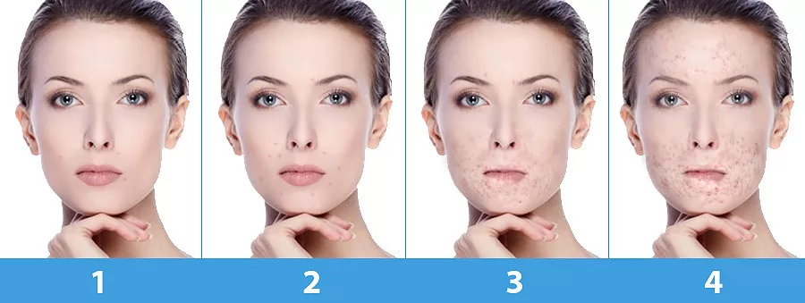 Высыпания в большинстве случаев локализуются в Т-зоне, покрывают лоб, щеки и подбородок. В зависимости от тяжести течения болезни, количества угрей и комедонов врачи выделяют несколько стадий развития: