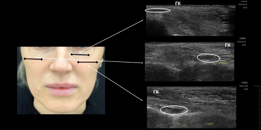 На рис. 1 представлено фотоизображение ультразвукового исследования препаратов для контурной пластики, введенных 12 месяцев назад: Teosyal Redensity 2 в области слезной борозды, Teosyal RHA4 в области mSOOF, Teosyal Ultra Deep в области DMC2, 3. При исследовании видны признаки резорбции гелей, в большей степени в области глубоких жировых пакетов средней трети лица, без формирования фиброзной капсулы вокруг геля.