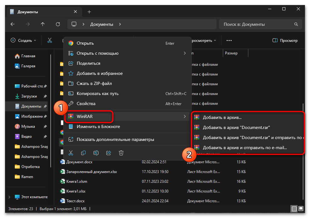 Что касается других архиваторов, например WinRAR, то они могут встраиваться в контекстное меню «Проводника», добавляя быстрые кнопки для действий. Пример такого вы видите на следующем скриншоте, поэтому иногда можно даже обойтись без запуска графического окна архиватора.