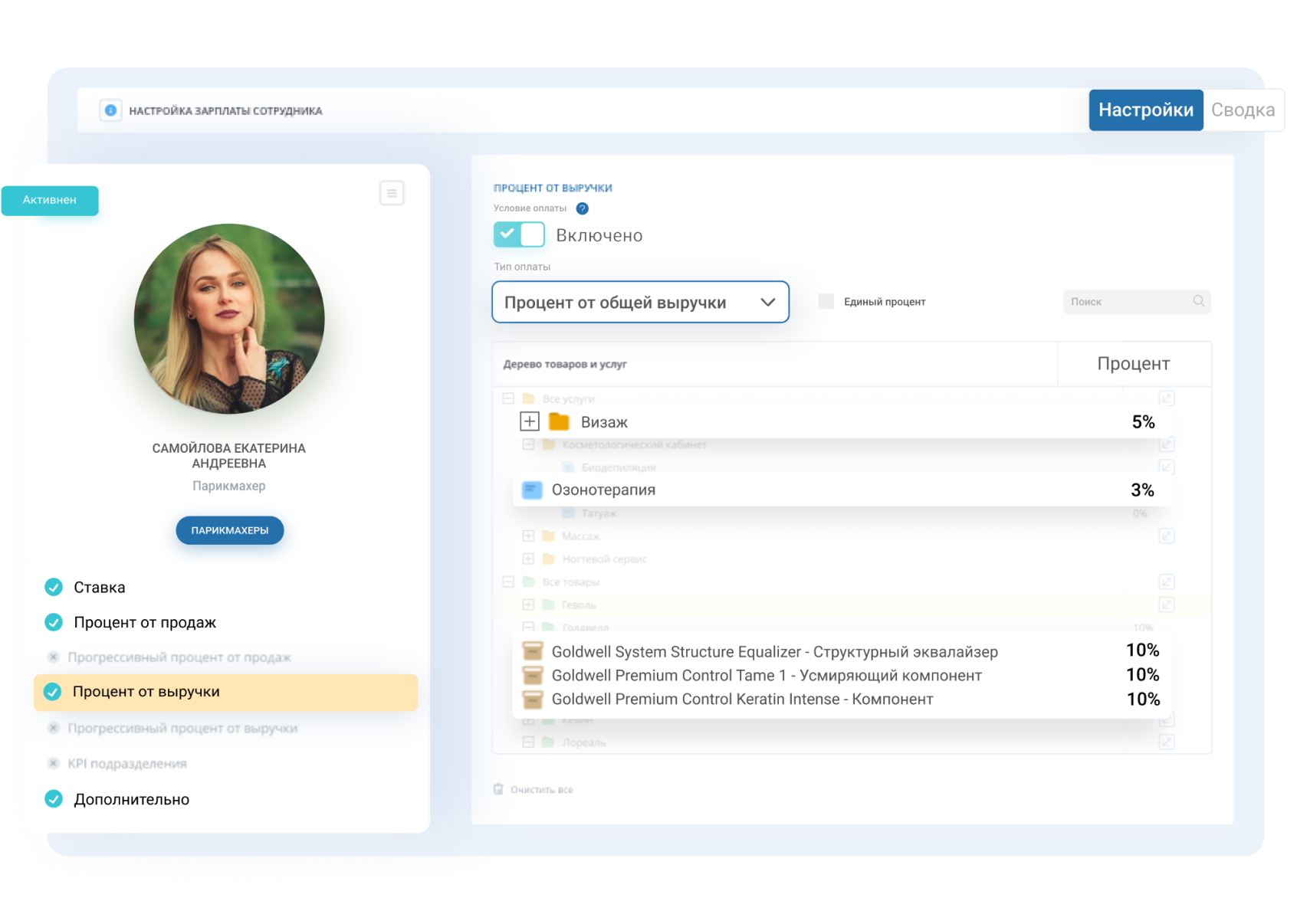 - Процент от продаж товаров и услуг, причем для товаров и услуг можно настроить разный процент;