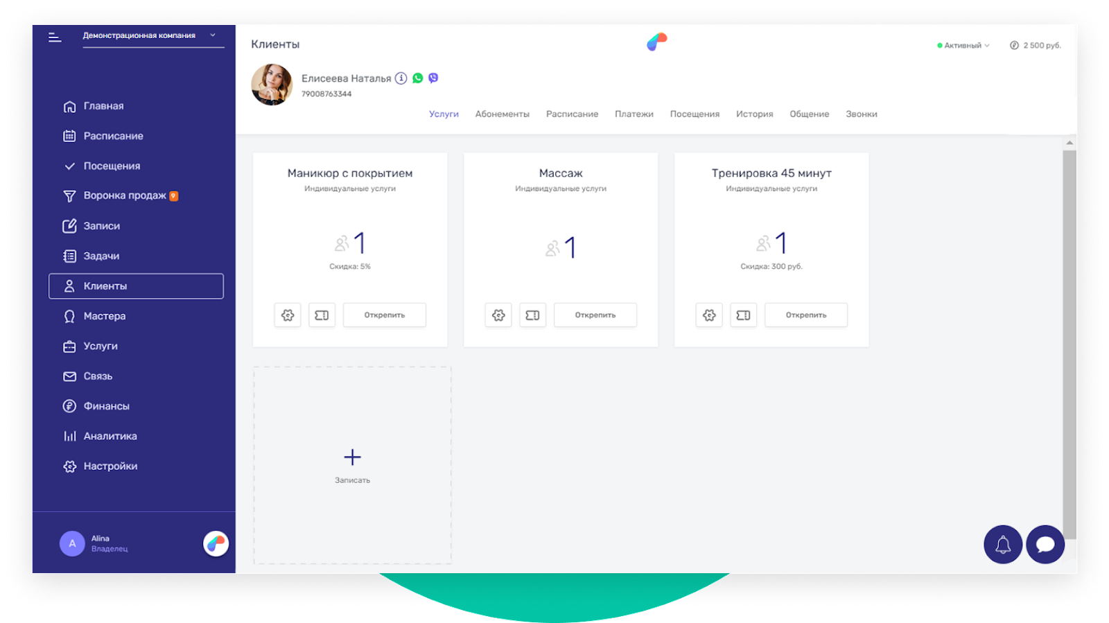 Ведение клиентской базы — система позволяет создавать подробные индивидуальные карточки для каждого клиента, куда заносится количество и наименование услуг.