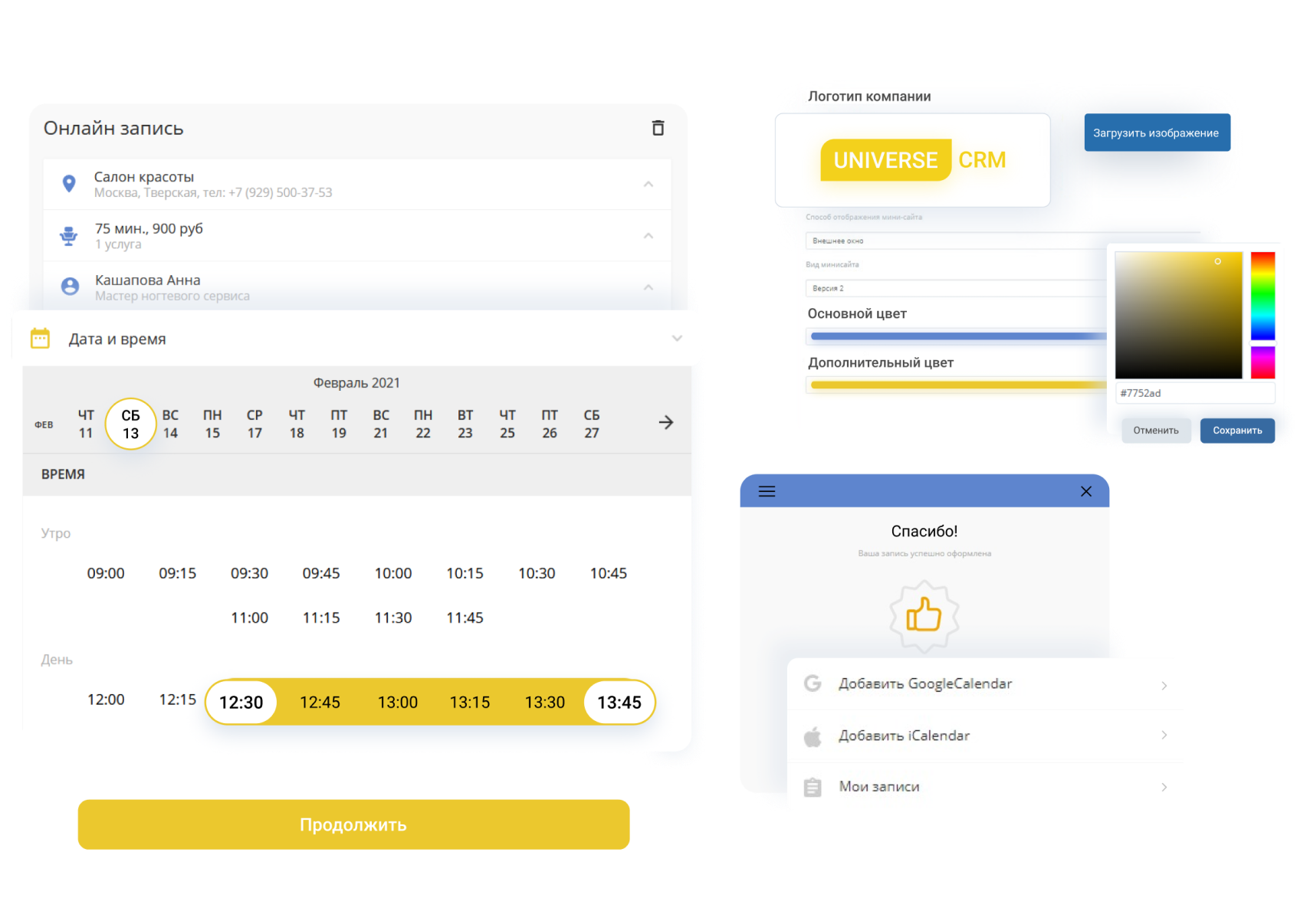 Онлайн-запись. С помощью виджета онлайн-записи клиенты могут записываться на услуги самостоятельно, без помощи администратора. И даже ночью, пока вы спите, сервис онлайн-записи обеспечивает загруженность салона. Записываясь онлайн, клиент получает доступ в свой личный кабинет, где он может видеть историю своих визитов, а также оставлять отзывы о ваших сотрудниках.