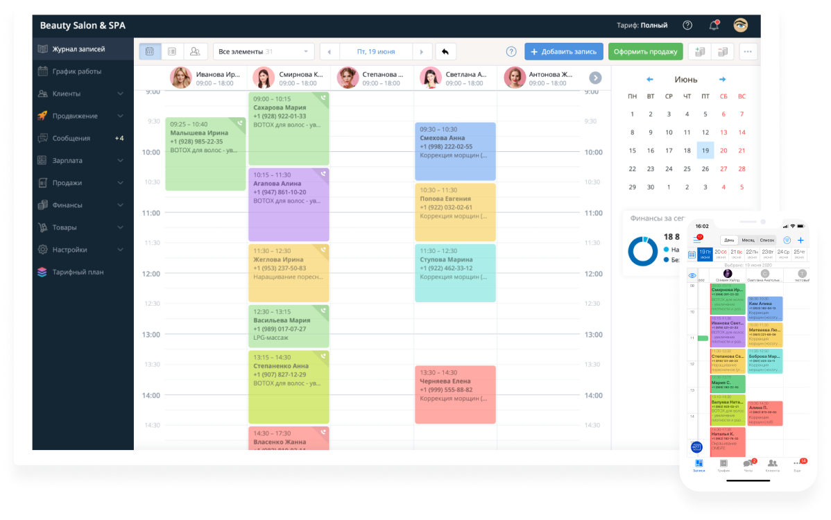 Функционал программы включает: управление клиентской базой, интеграция с сервисами, виджет онлайн-записи, аналитика данных и другие.