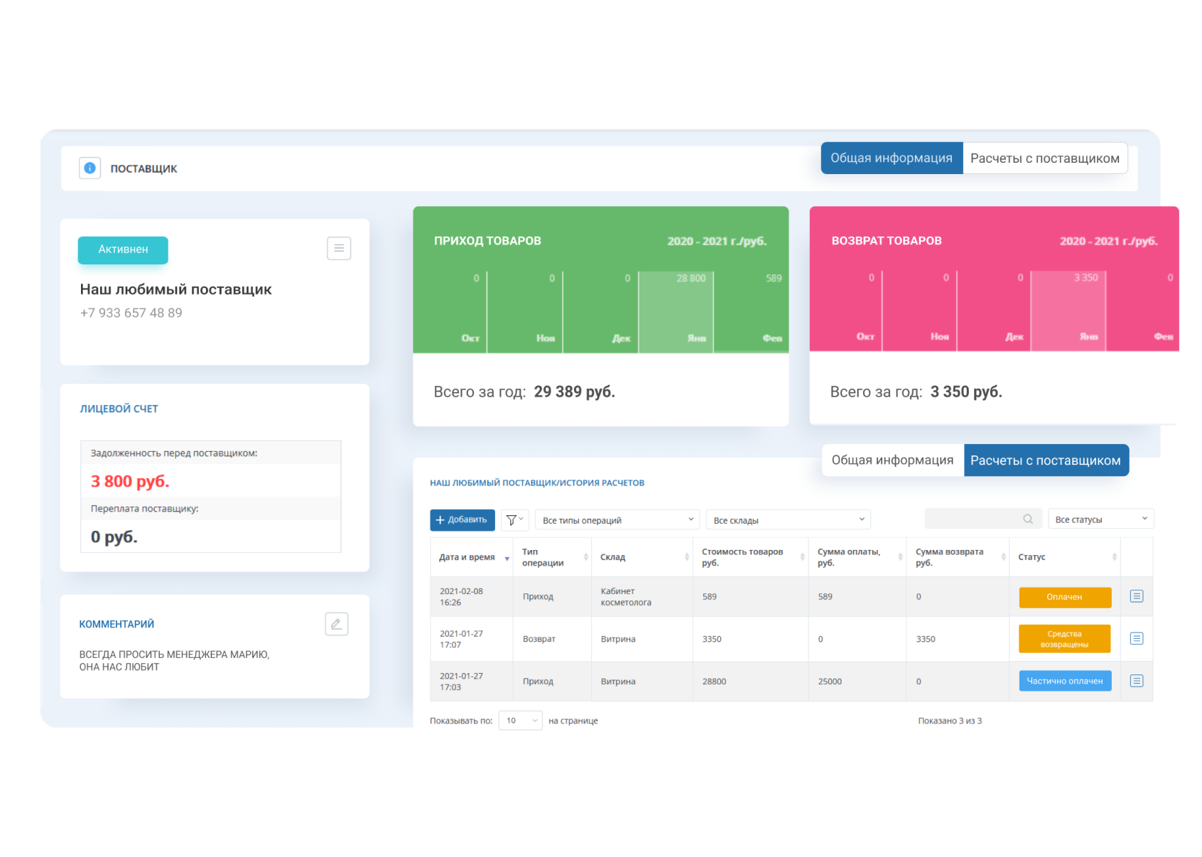 Складской учет. Для эффективного управления салоном красоты мы продумали изящный логистический процесс, который автоматически учитывает расход препаратов при оказании услуг, контролирует взаимоотношения с поставщиками, анализирует движение товаров и складских остатков.