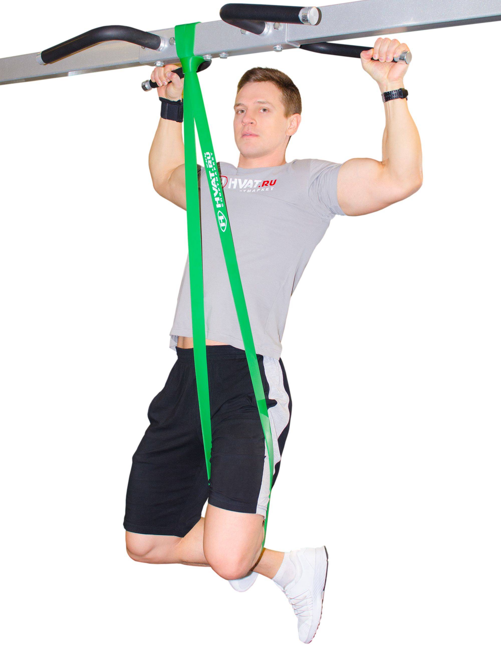 Их нужно закрепить к турнику, в образованную в нижней части петлю поместить колени. Резиновый жгут возьмет на себя часть нагрузки и поможет научиться подтягиваться.