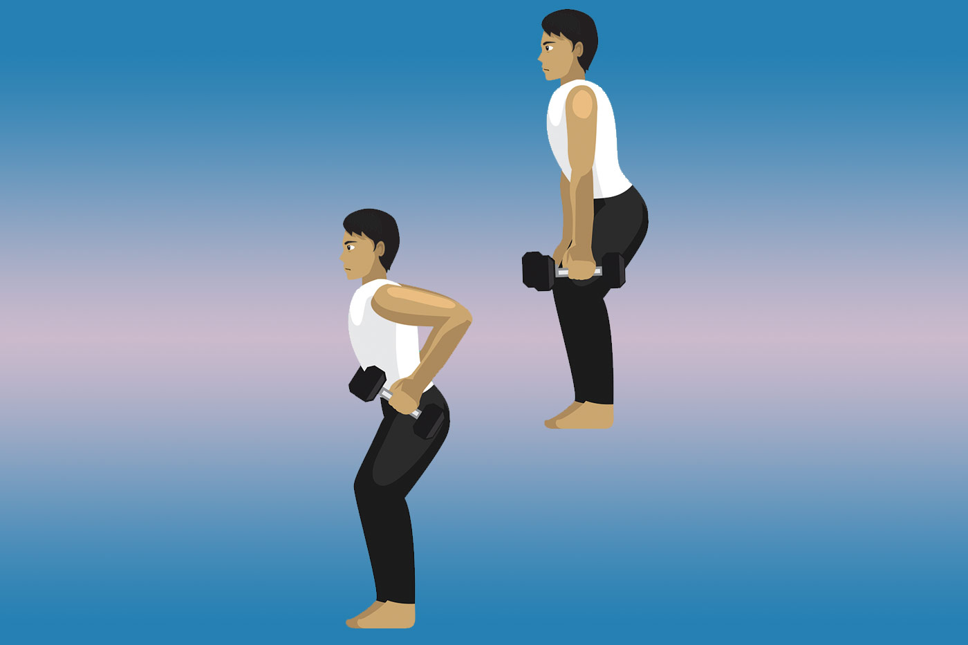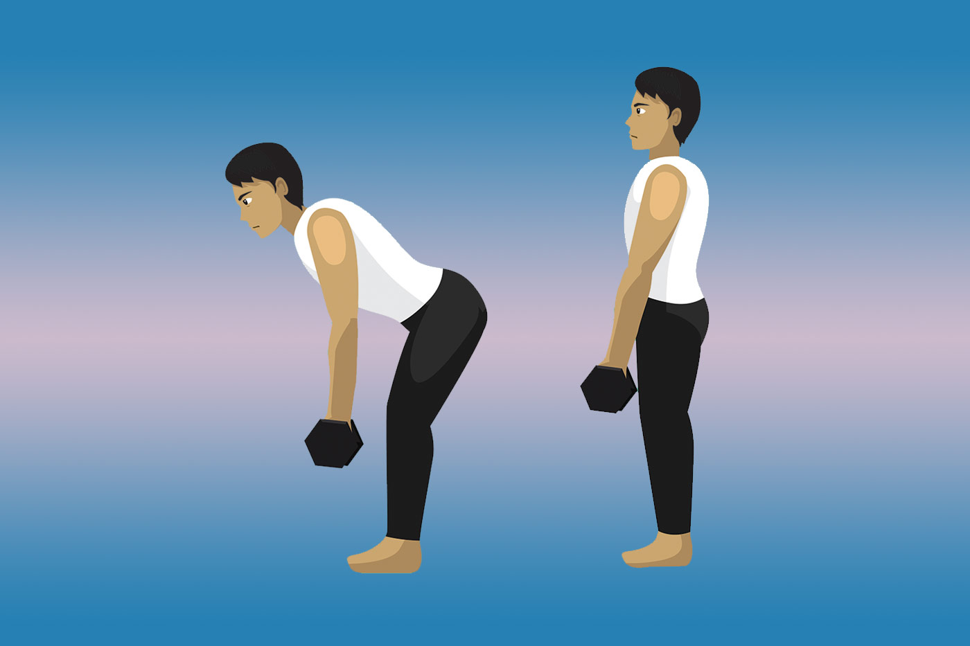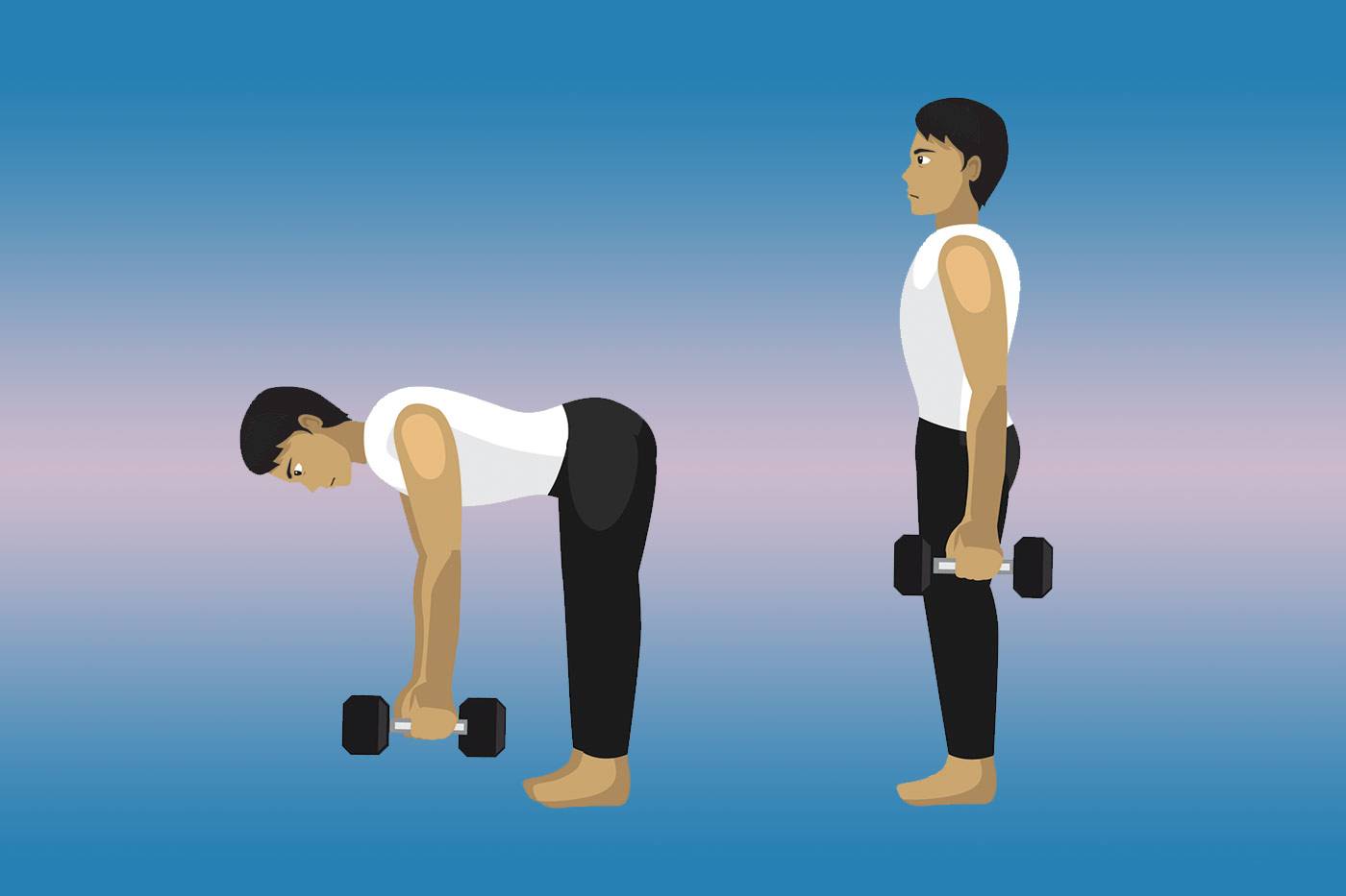 Наклонившись вперёд и взяв в руки гантели, на выдохе распрямите корпус и поднимитесь вверх — основная нагрузка приходится на низ спины и на мышцы-разгибатели позвоночника.