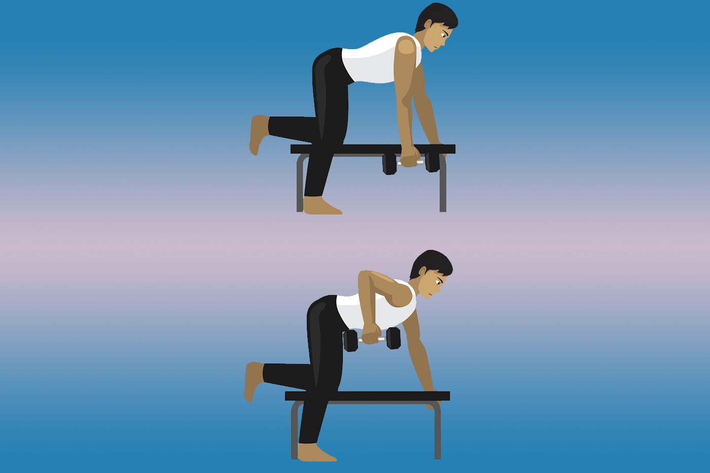 Расположив одну ногу на скамье и опираясь на неё рукой, подтягивайте гантель по направлению к поясу — следя за тем, чтобы спина была ровной, а локоть не уходил в сторону.