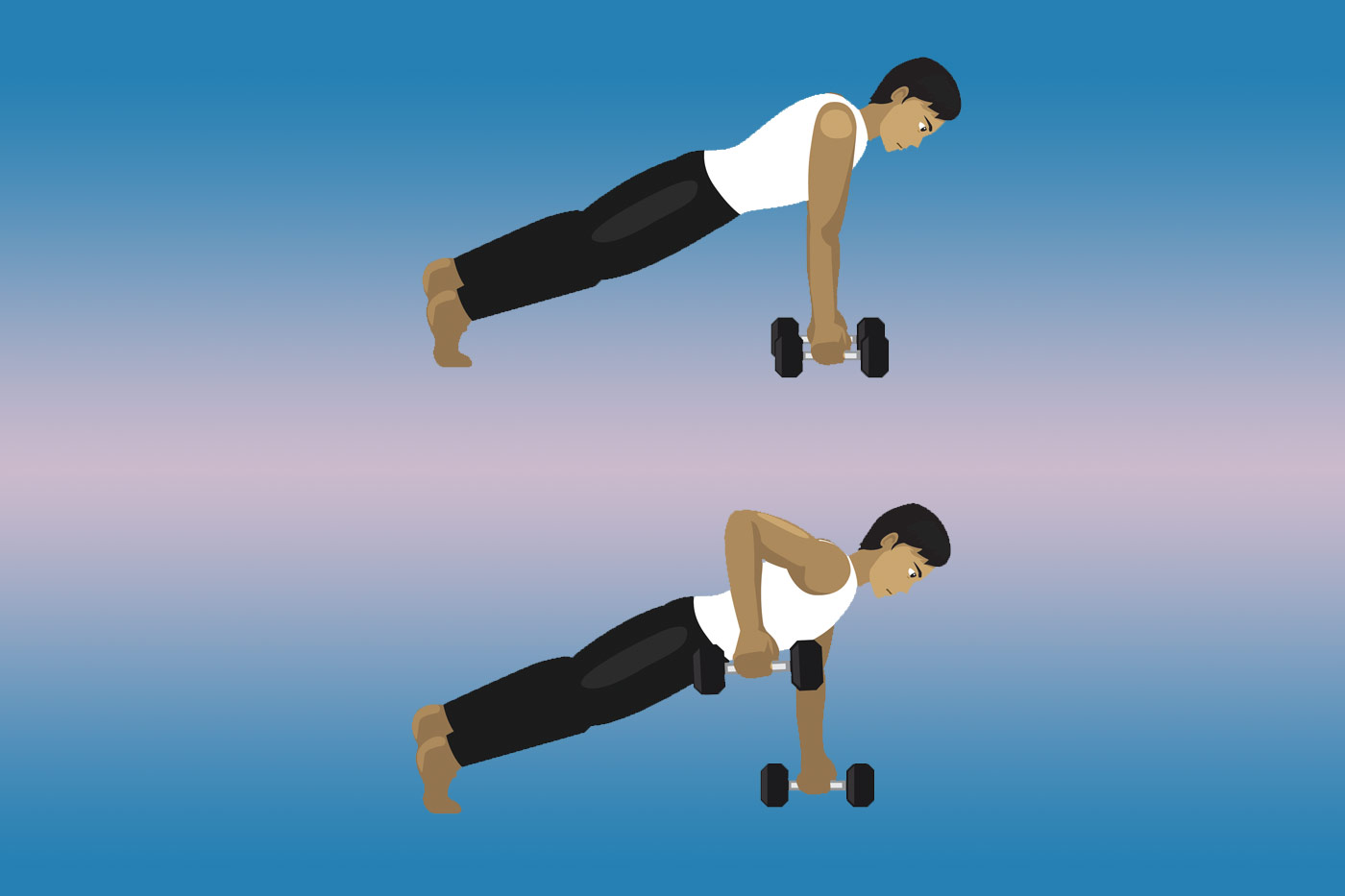 Находясь в положении упор на прямых руках (держащих гантели) совершайте поочерёдные подтягивания веса по направлению к груди — следя за тем, чтобы локти не уходили в стороны.