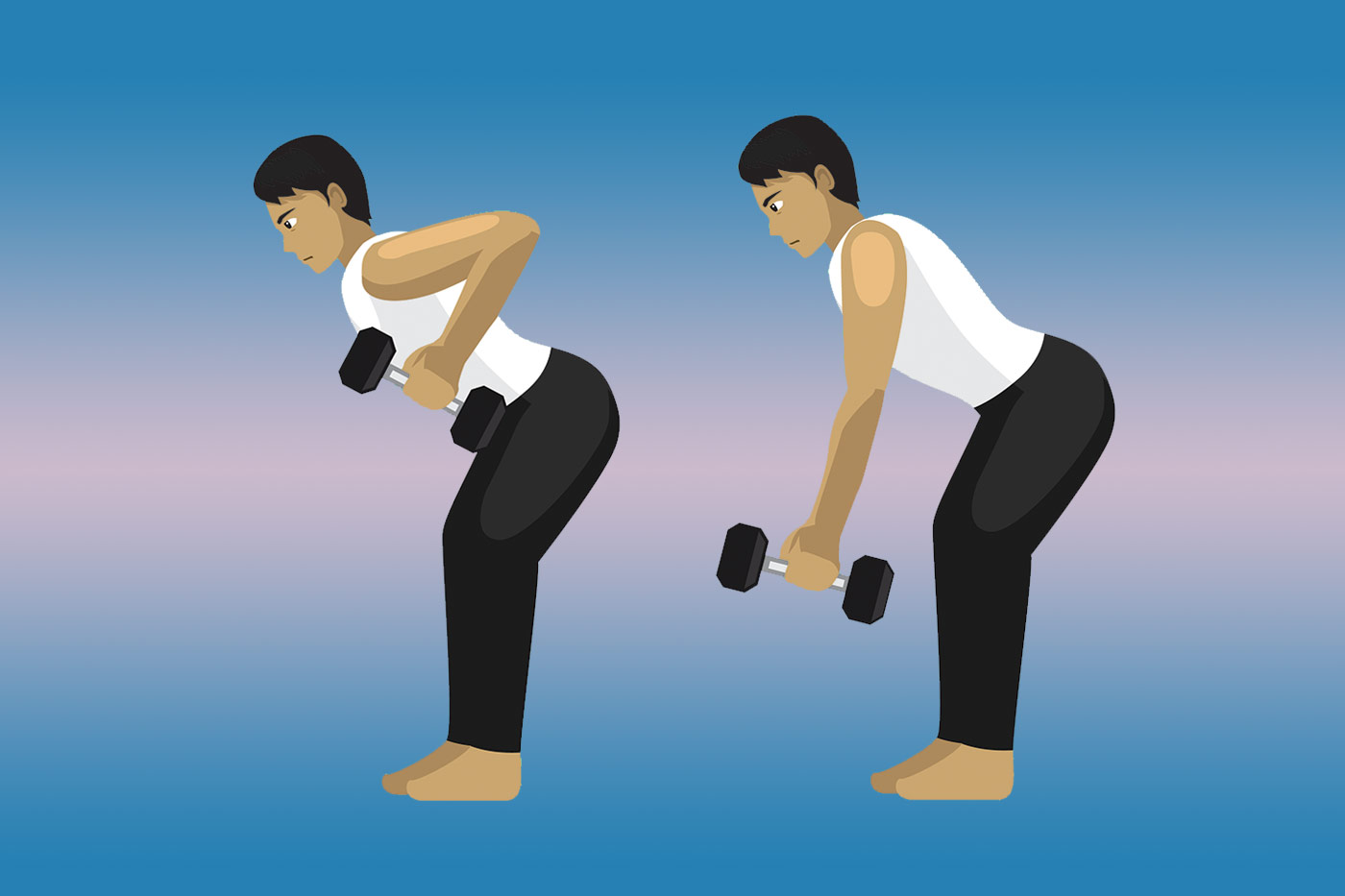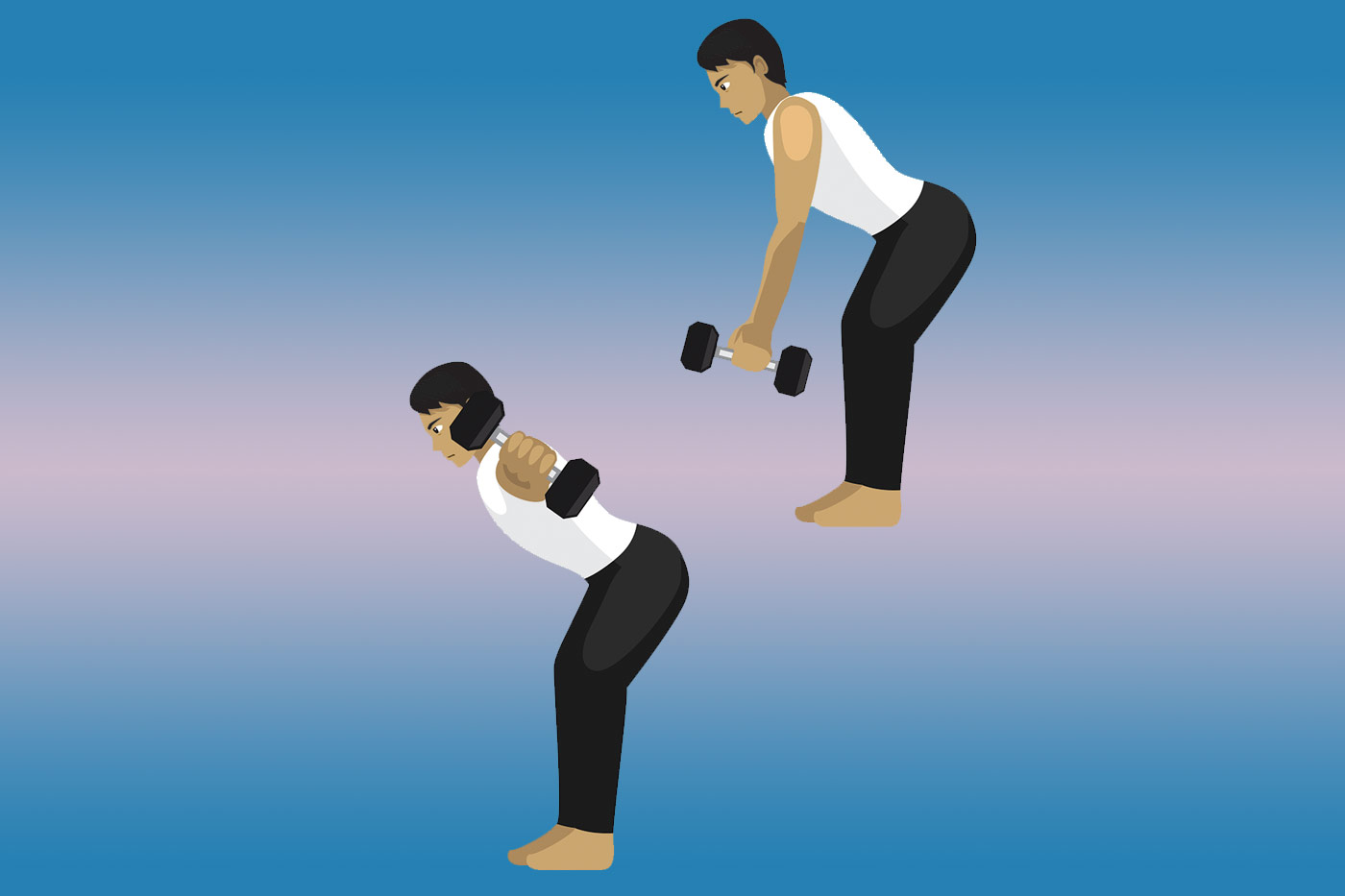 Исходное положение аналогично первому упражнению (разведению гантелей в наклоне) — однако вместо поднятия рук в стороны подтягивайте вес по направлению к поясу.