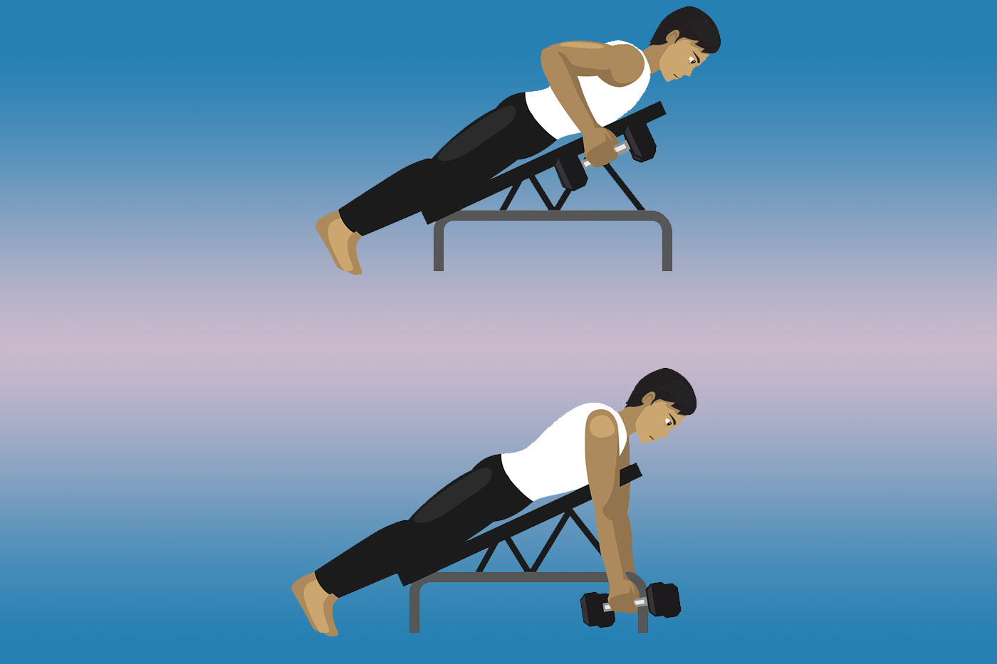 Упражнение также повторяет предыдущие 2 движения — однако при опоре корпуса на скамью можно использовать более тяжелый вес гантелей.