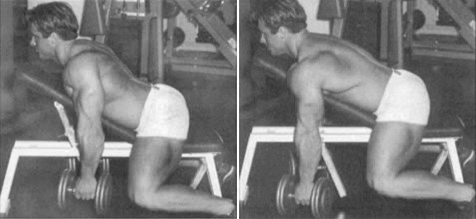 Упражнение напоминает тягу штанги или гантелей к поясу на наклонной скамье. Нужно лечь лицом вниз, животом на скамью и приводить гантели вверх, работая только плечами. Этот вариант упражнения является наименее травмоопасным для позвоночника, но требует использования только легких весов, так как положение сустава не естественное для выполнения шрагов.
