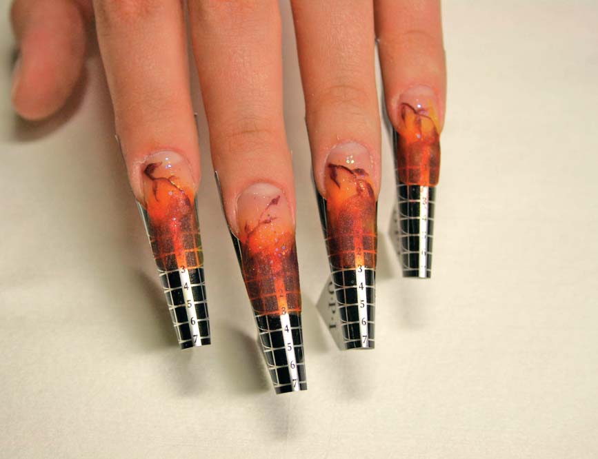 После того как новые ногти готовы, можно предложить клиенту покрыть их декоративным лаком или украсить рисунком. В завершение в кутикулу втирается питательное масло.