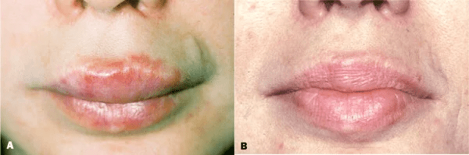 Эффект вывернутых губ возможен, если вводится излишек филлера со стороны их слизистой оболочки. В результате слизистая контактирует с воздухом, высыхает и трескается, появляется локальное воспаление. Если не исправить ситуацию, возможны хейлит и стоматит. Кроме того, дефект заметен со стороны, потому что слизистая светлее кожного покрова. Неравномерное введение геля на границе красной каймы и слизистой приводит к появлению волнообразного края губ.