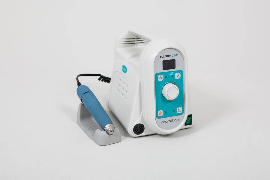 Оборудование для аппаратного маникюра называют фрезером. Он представлен в виде специальной ручки, соединенной шнуром с процессором. На ручке фиксируются насадки, включая фрезы. Процессор выполняет вращение насадок в необходимом темпе и направлении.
