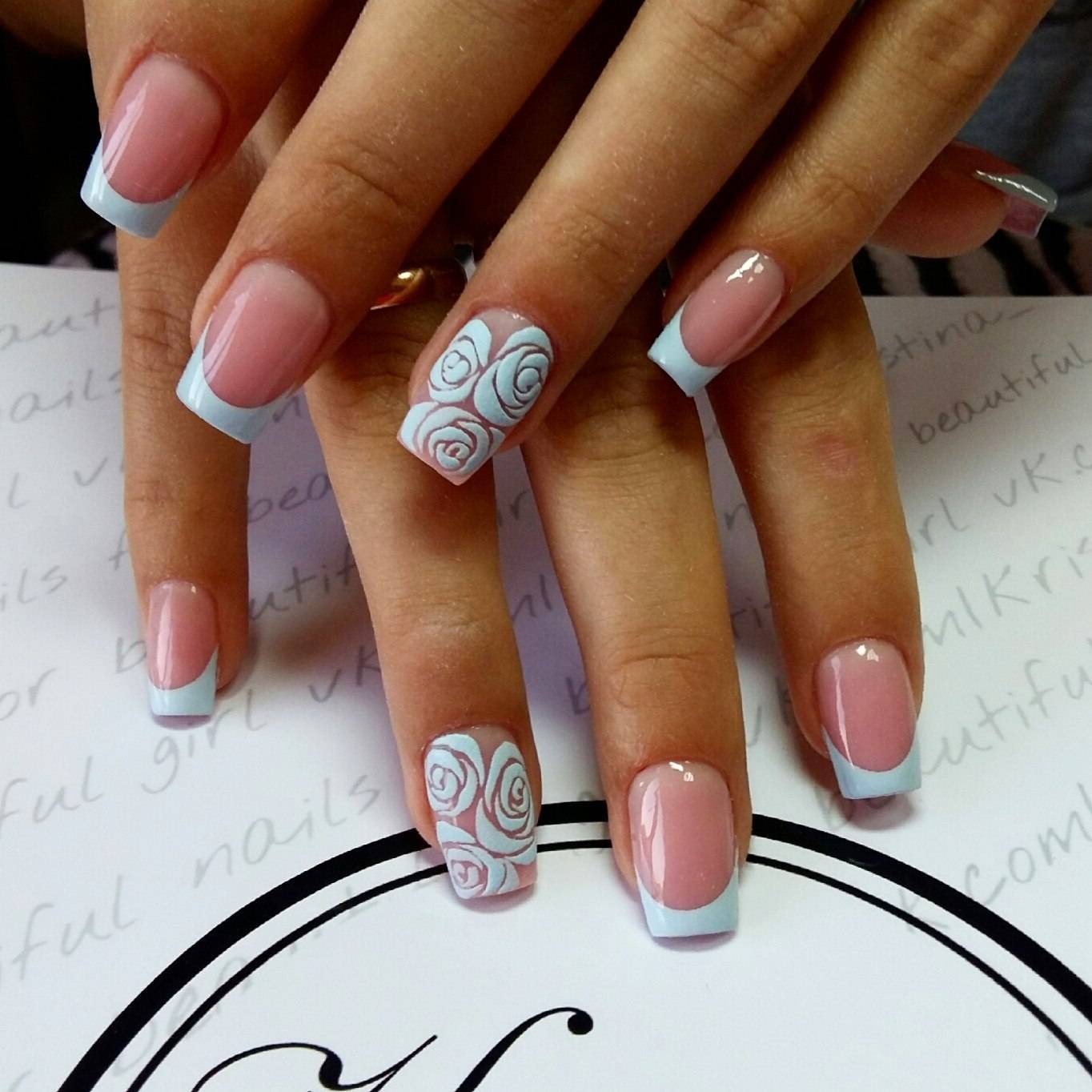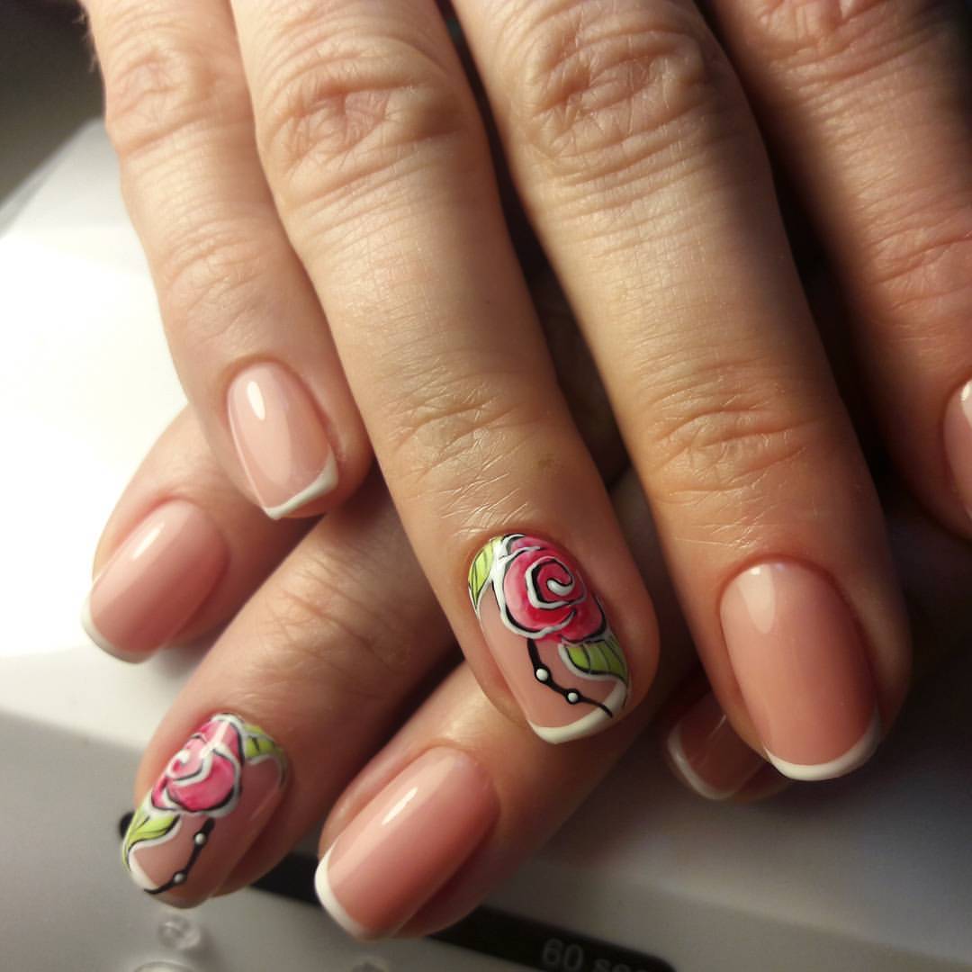 Такое сочетание считается самым гармоничным в нейл-арте. Действительно милый и благородный френч без проблем уживается с нежными розами. В классическом исполнении на ноготках прорисовывается «линия улыбки», а остальное пространство заполняется оригинальными и яркими цветами.