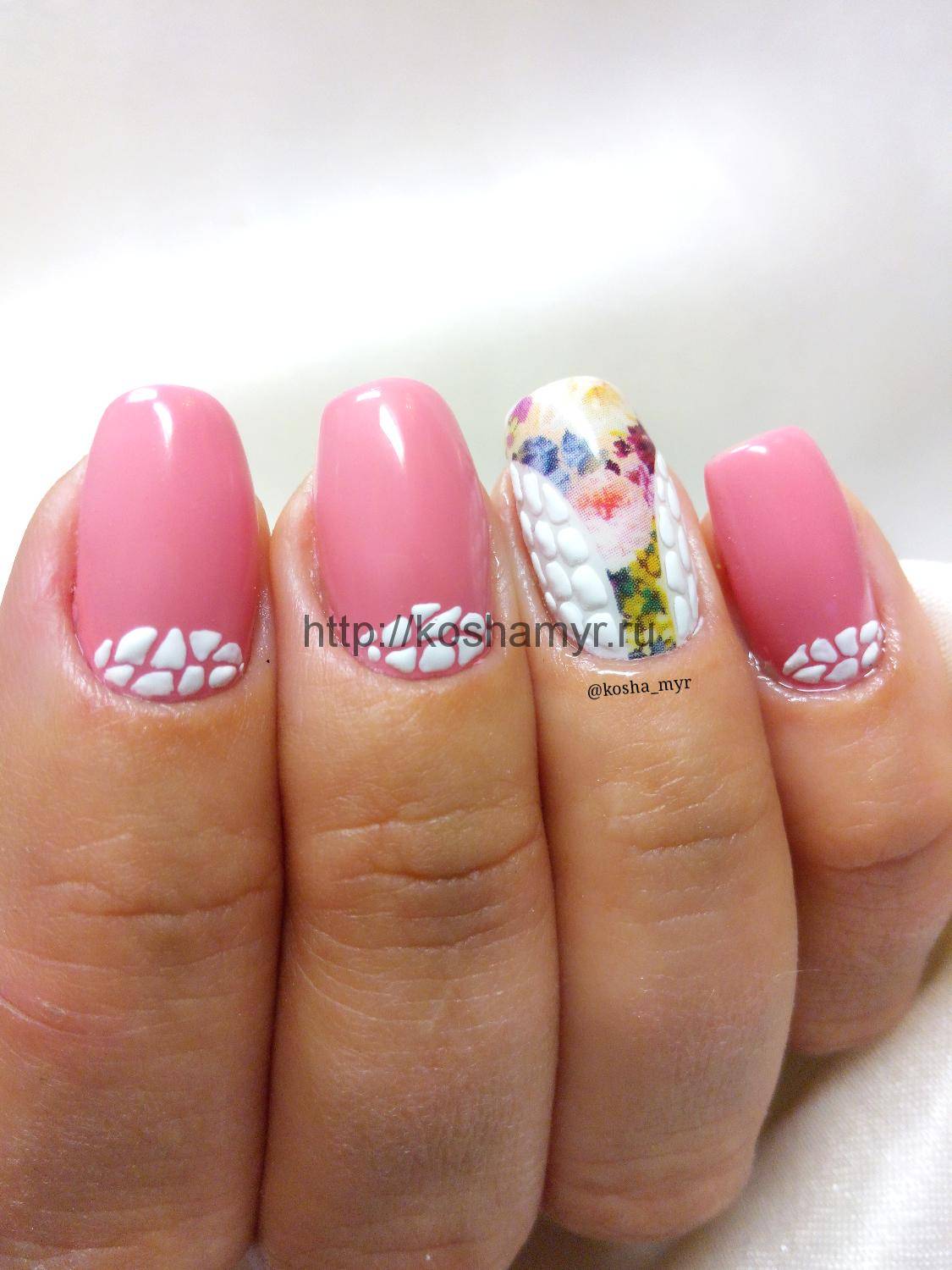 Великолепно выглядят красные распустившиеся бутоны на полупрозрачном или бежевом фоне. Если у вас короткие ногти, отдавайте предпочтение рисункам поменьше. Крупные розы выглядят вульгарно, а слишком мелкие будут сливаться в единую композицию в розовом цвете.