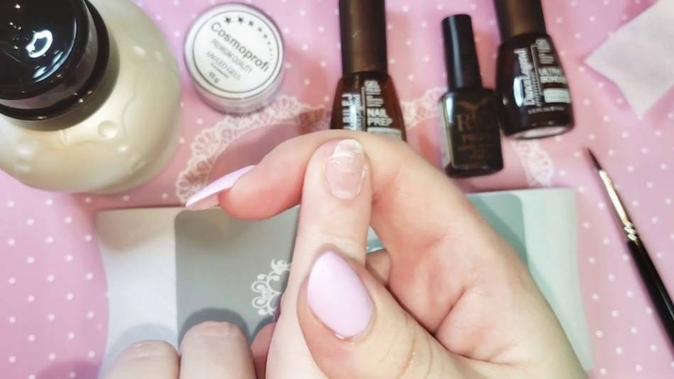 - Нанести один слой базового геля. Просушить в лампе и снять липкую поверхность обезжиривателем.